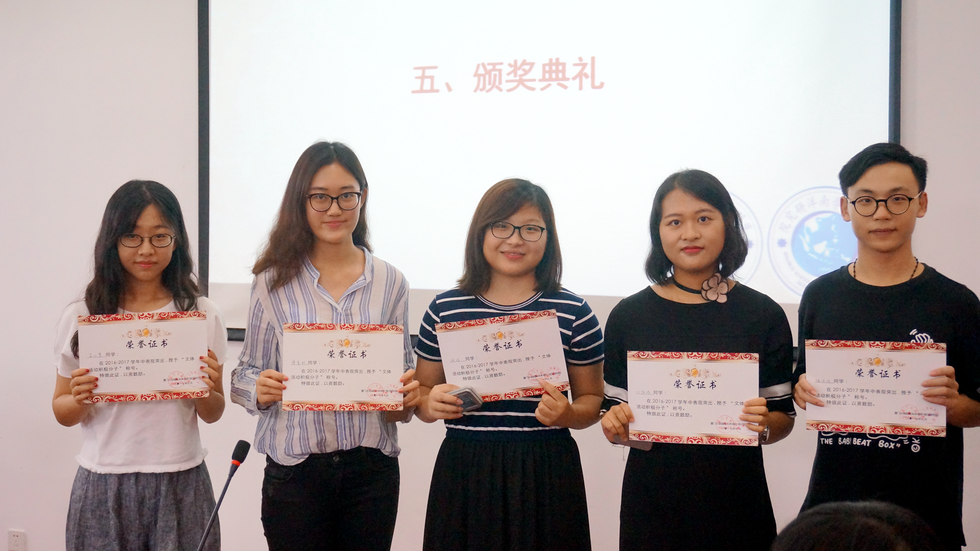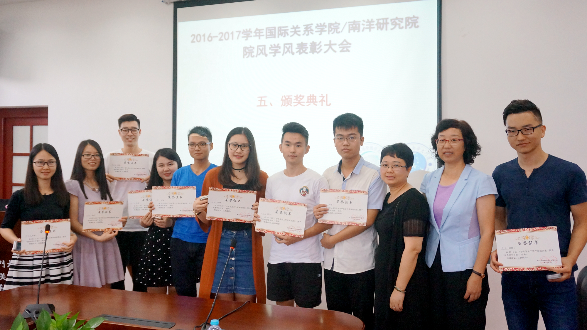 2017年6月14日10时30分,2016-2017年国际关系学院/南洋研究院院风学风表彰大会在南安楼301(3)举行,院党委书记范丽、副院长施雪琴、院党委副书记黄俊清、国际关系系副主任张旭东、团委书记沈丽秀和辅导员郭晓玲出席本次表彰大会并为获奖同学颁奖。