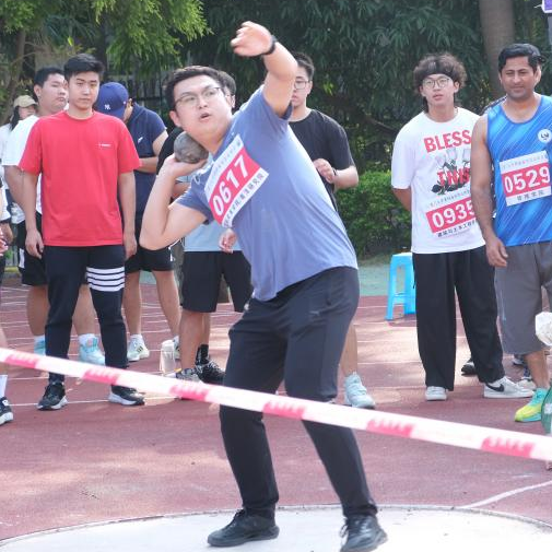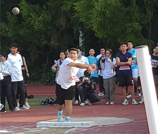 在男子本科生组铅球比赛中,顾奉攀、杨本嘉同学以及男子研究生组钟毅平同学手中紧握着那沉重的铅球,挥舞着充满力量的双臂,沉心屏气,奋力一掷,掷出决心,推出理想,让希望在空中发光。