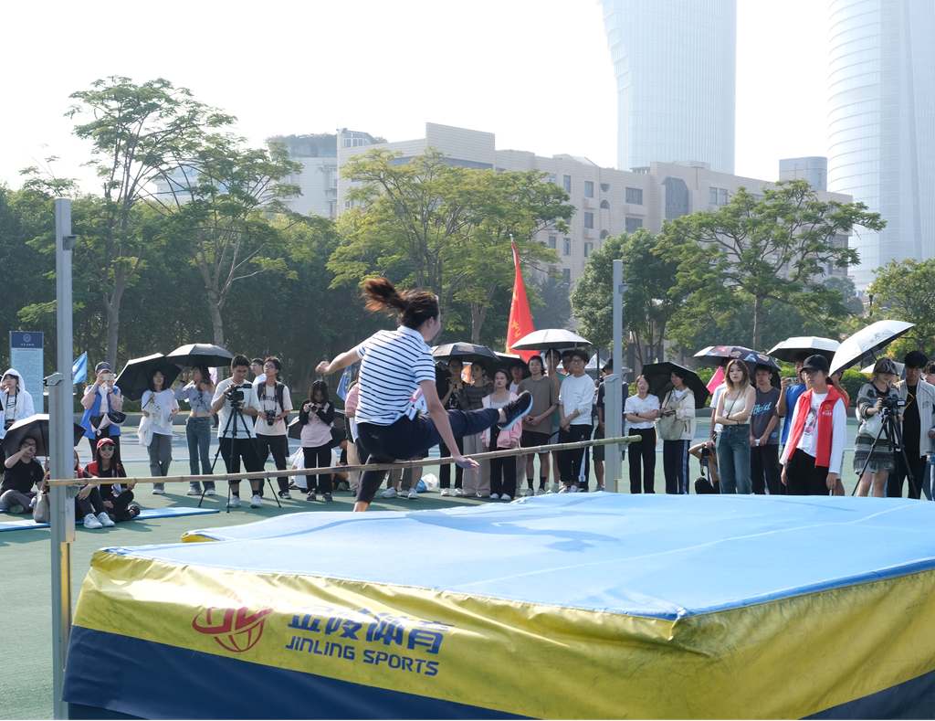 在女子本科生组跳高比赛中,董鑫妍同学快速起跑,纵身一跃,腾空掠杆,稳稳落地,那如飞燕般行云流水的动作里蕴藏着磅礴的力量,让正在追梦的她去摘属于自己的星星。