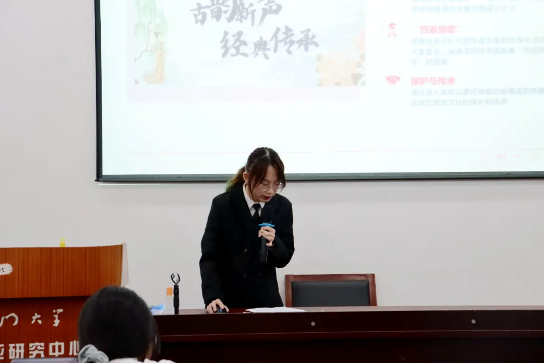第三组“古韵新声”实践队选取拥有丰厚历史底蕴的闽南语作为研究对象,研究闽南语在信息化时代的传承发展。闽南语承载着历史记忆和价值理念,但信息化时代的发展以及标准化语言的普及使得闽南语的传承陷入困境。实践队对不同媒体中的闽南语传播现状进行了研究,并提供一系列的参考建议,以推动闽南语的传播、地方语言文化的保护和传承。