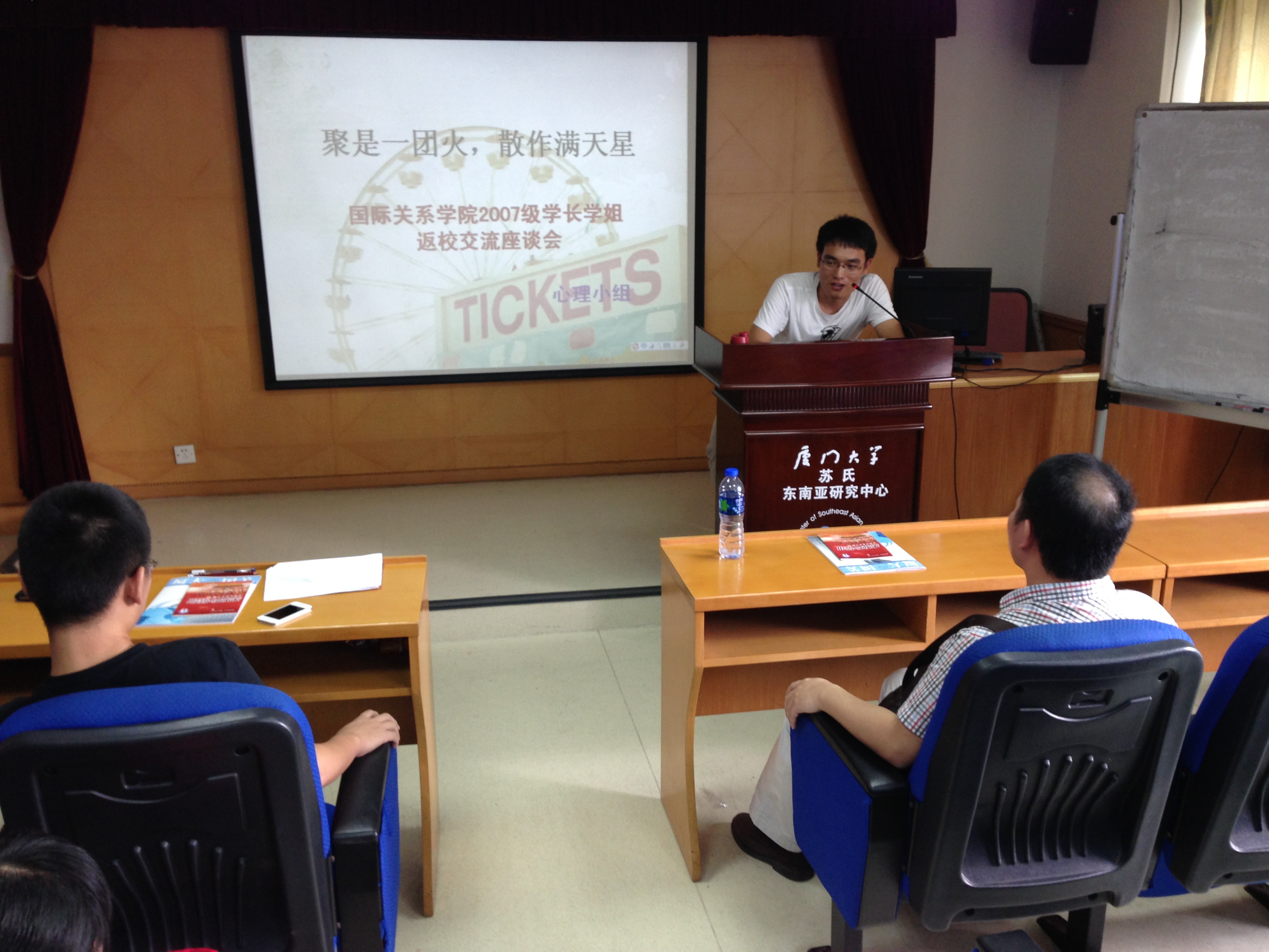 2013年5月26日星期日下午三点,国际关系学院2007级学长返校交流座谈会于厦门大学本部颂恩楼514室举办。南洋研究院2012级研究生周亭佑主持了本次座谈会。我院2007级本科生也是我院第一届本科毕业生胡迪、黄朝全和李建东来到会场向学弟学妹们分享了他们的在校经历、工作情况和人生感悟。