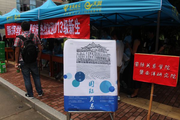2013年8月24日,对于厦门大学2013级本科生来说,是一个特别的日子——从那开始的两天,他们将携带着大包小包的行李与对大学生活的憧憬,步入厦大校园,正式成为厦大学子。而与此同时,各个学院的迎新工作也紧锣密鼓地展开来,国际关系学院/南洋研究院亦不例外。23日下午,位于芙蓉湖畔自钦楼旁的国际关系学院\南洋研究院迎新点就早早搭起帐篷,迎新点基本布置完成后,三位同学特别在雨中值班到晚上,以防提前到的新生无人接待。