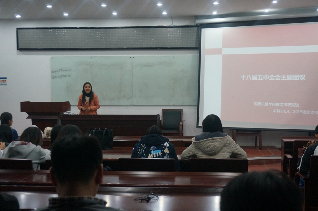 2015年12月17日下午五点,厦门大学国际关系学院暨南洋研究院2014级和2015级的本科生在南安楼开展了以“学习十八届五中全会”为主题的团课。本次团课由2014级本科生团支书刘宇彤主持。