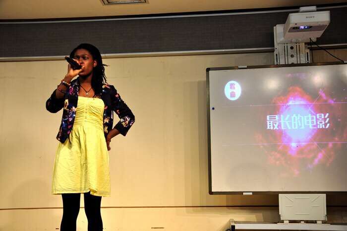 晚会的最后一个节目,是来自特立尼达和多巴哥的2015级外籍生宋娜依(Shonae)演唱的《最长的电影》。宋娜依同学展现出惊人的歌唱功底与爆发力,高音处丝毫不影响音准,可谓惊艳全场,赢得场下经久不息的掌声。