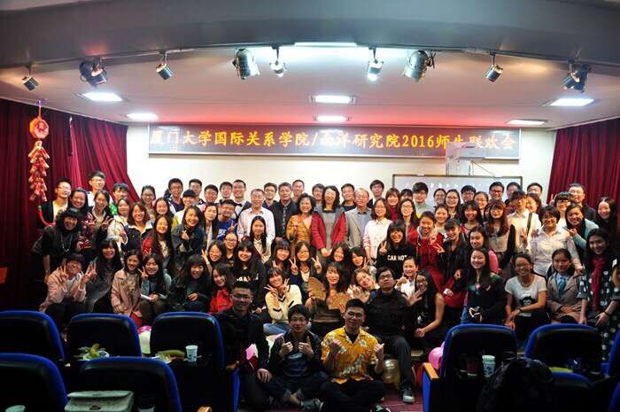 2015年12月26日晚7点,厦门大学国际关系学院暨南洋研究院2016师生新年联欢晚会在艺术学院小音乐厅拉开帷幕。出席晚会的有国际关系学院院长李一平、党委书记范丽、党委副书记黄俊清、国际关系系主任赵海立、团委书记沈丽秀、黄飞、朱鸿婕等诸位老师。近三个小时的精彩表演,时而青春活力,时而静谧舒缓,有百态千姿的异域文化,更有沉郁跌宕的年度大剧。来自四面八方的全院师生各展才华,精彩纷呈,其乐融融。
