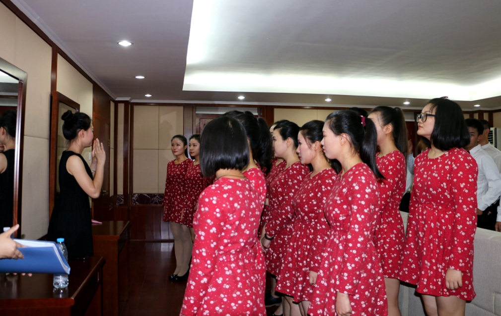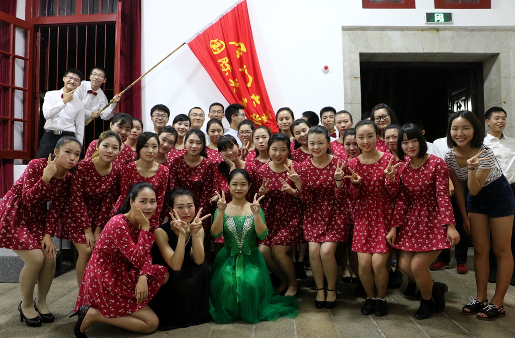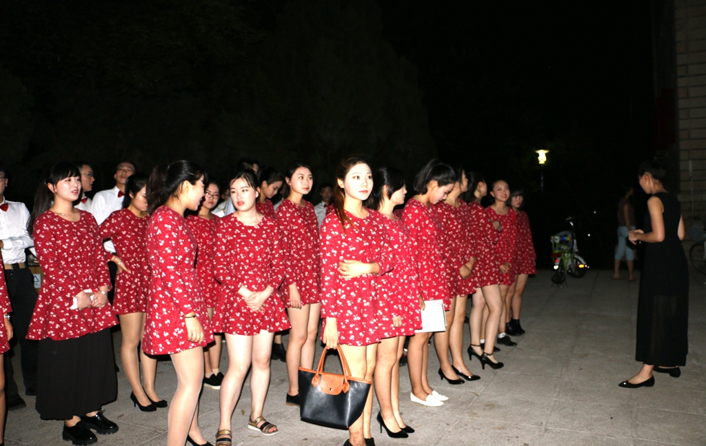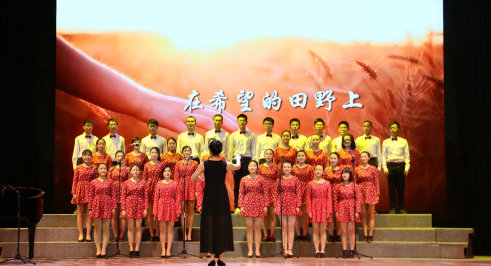 我院2015级本科生表演曲目为《在希望的田野上》,指导老师为柯毅捷,陈静灵,钢琴伴奏是庄白薇,田纪原担任摇旗手。女生们身着红色碎花连衣裙,黑色皮鞋,男生们穿白衬衣,黑色西裤。大家带着自信的笑容,迈着轻快的步伐,走上了灯光闪耀的舞台。