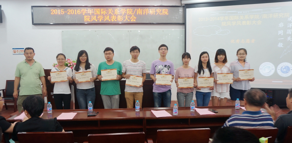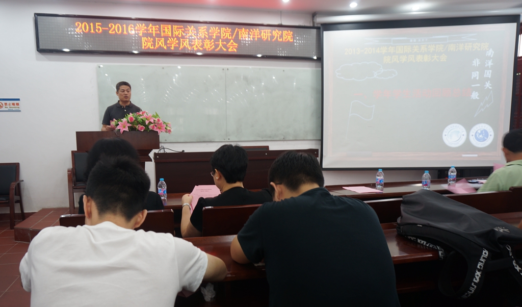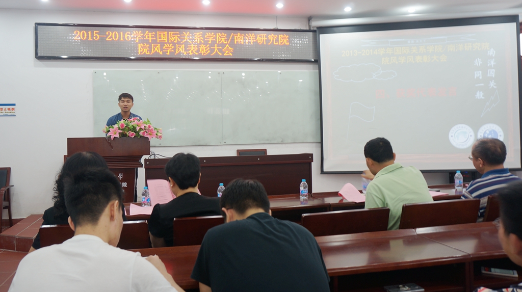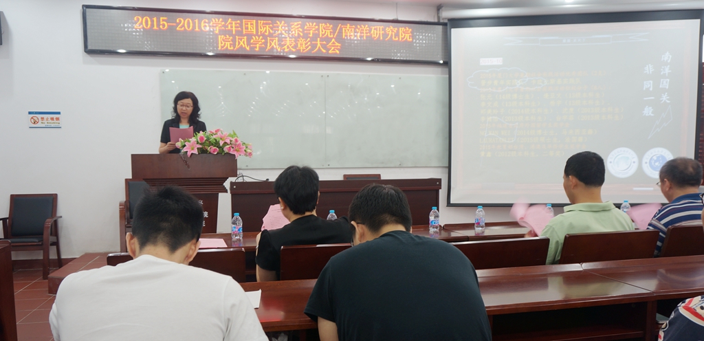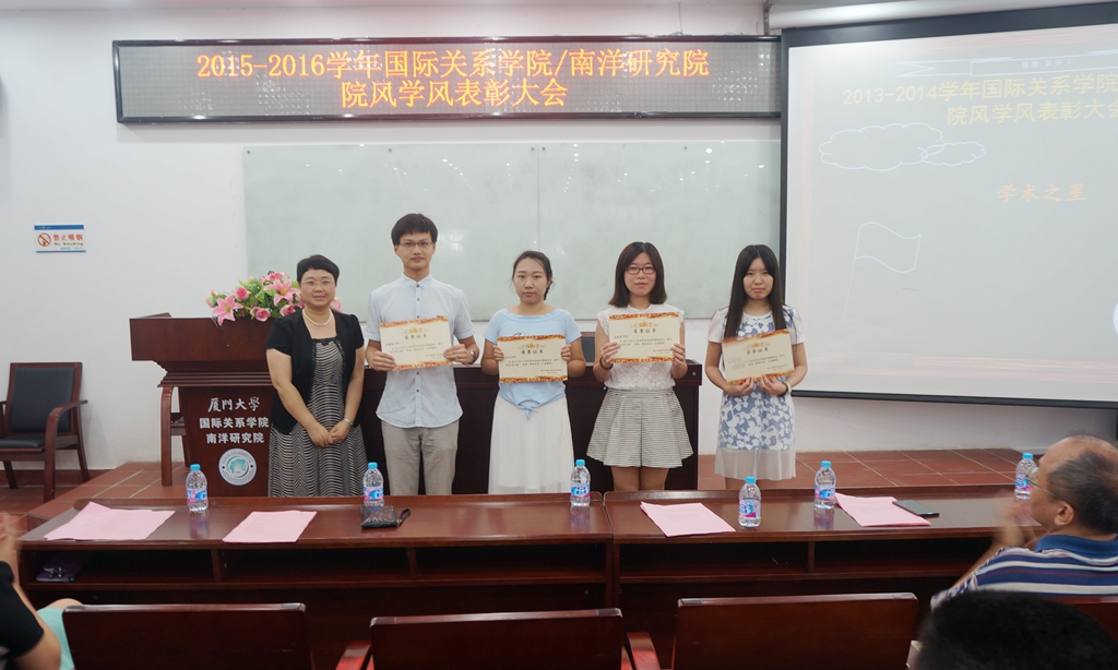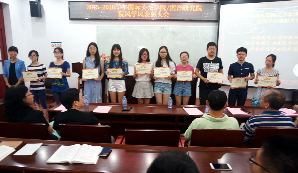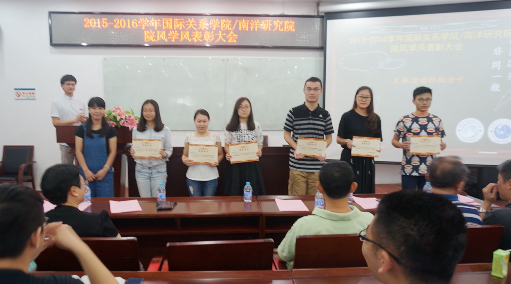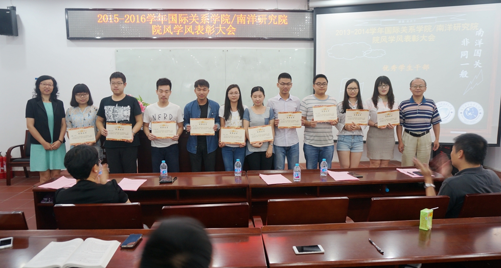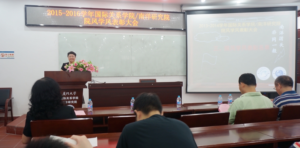 2016年6月3日9时许,2015-2016年国际关系学院/南洋研究院院风学风表彰大会在南安楼101举行,国际关系学院/南洋研究院党委书记范丽、院长李一平、党委副书记黄俊清、副院长施雪琴、国际关系系副主任张旭东、团委书记沈丽秀和辅导员郭晓玲出席本次表彰大会并为获奖同学颁奖。