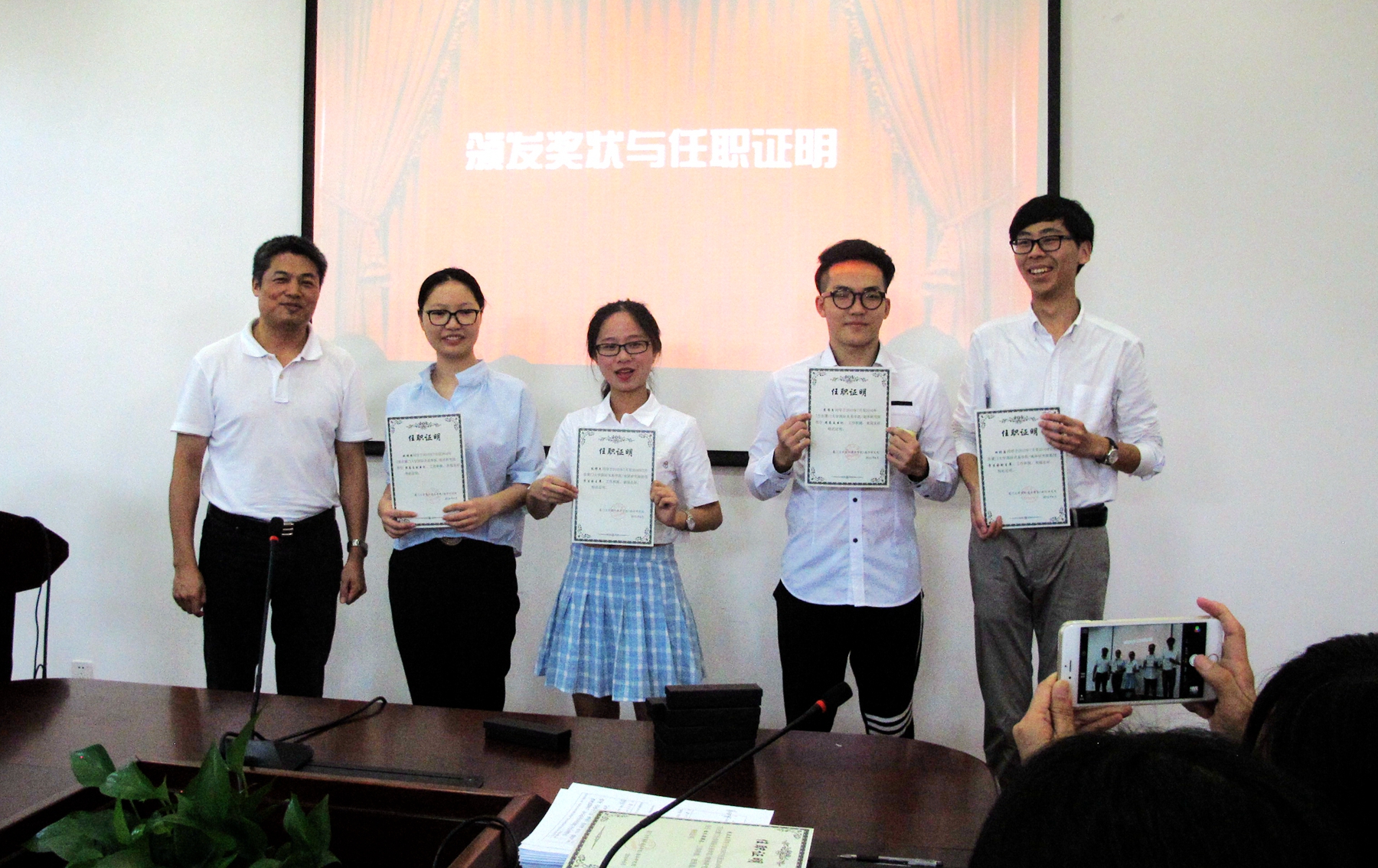 会议的第二个环节是由到场老师为上一年度表现出色的学生干部进行表彰和授予任职证书。一份份沉甸甸的证书证明了他们在过去一年内所作的贡献,肯定了他们的责任心与能力。