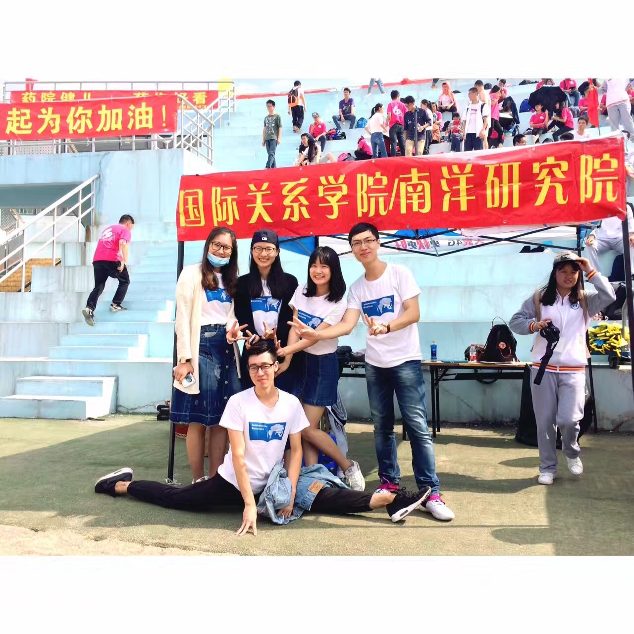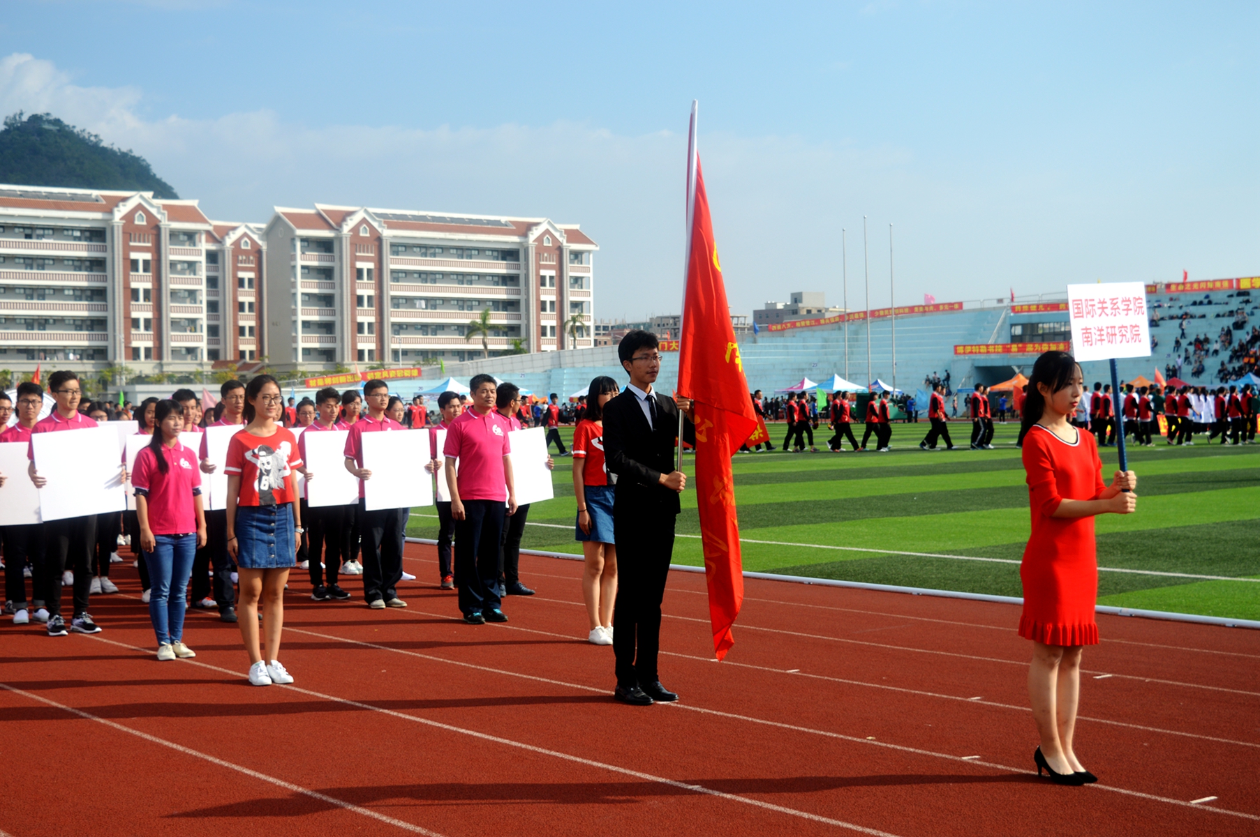 2016年11月4日,厦门大学第51届田径运动会在翔安校区正式开始,共有29个学院参加本次校运会。开幕式上,在学院党委副书记黄俊清和辅导员郭晓玲的共同参与下,厦门大学国际关系学院暨南洋研究院充满信心地踏入会场,开始了校运会的征途!