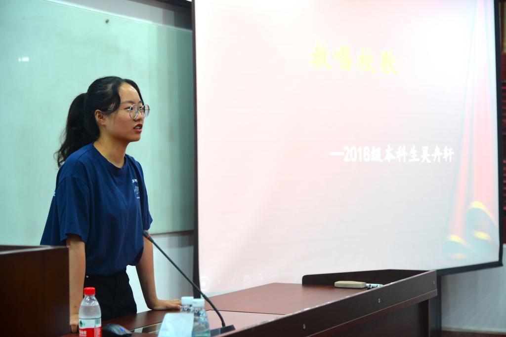 校歌学习完毕,进入了活动的第二项内容——奖助学贷介绍和入党申请书撰写介绍。兼职辅导员徐桐向大家介绍了我校奖学金、助学金等的申请流程及要求,并且鼓励大家认真对待学习任务、积极参加学校和学院的活动,让大学时光更加充实。