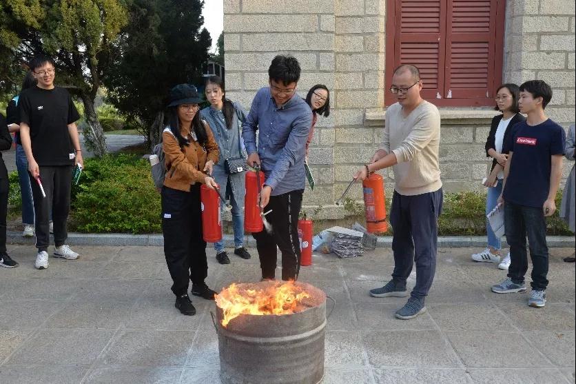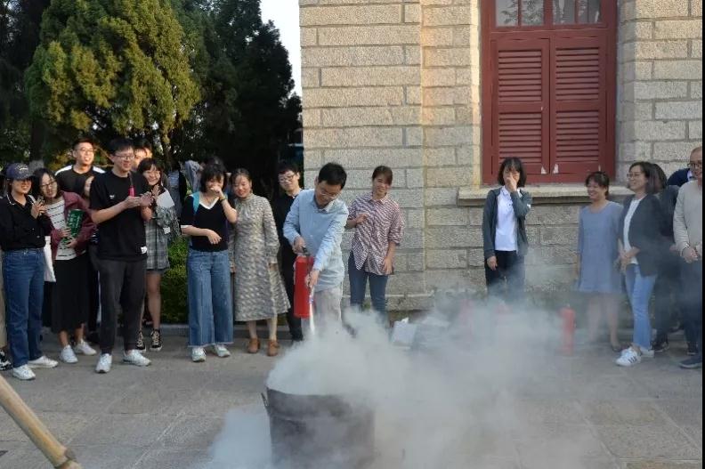 伴随着陈伟老师的报告,现场在火桶中燃起火焰,演练活动进入了第二项安排——消防器械的使用学习。孙俊逸副科长向在场的师生详细地讲解的灭火器的使用方法,以及注意事项,并且亲自做了示范,成功将目标火堆扑灭。接下来,在场师生分组对灭火器的使用进行实地演练。