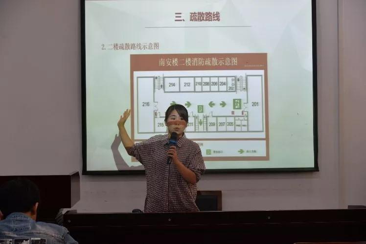 疏散完毕后,各班级负责人迅速清点班级人数,并上报给现场总指挥,学院党委副书记陈伟老师,确保没有人员发生意外,或者滞留“火灾现场”。陈伟老师在汇总了各班级负责人的数据后,向现场做了疏散工作总结,报告本次消防疏散用时、疏散到场人数等疏散情况。