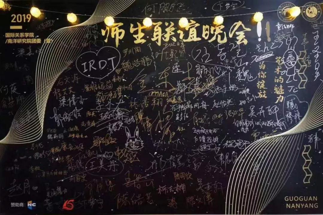 2019年12月20日,厦门大学联兴楼多功能厅见证了一场盛大而欢乐的聚会:这天晚上,厦门大学国际关系学院/南洋研究院举办了师生联谊晚会,学院党委书记张必华、院长李一平、吴崇伯副院长、院党委副书记陈伟、张淼老师、王昭晖老师、刘计峰老师、曾祥轩老师、郭晓玲老师和全院学生到场参加!