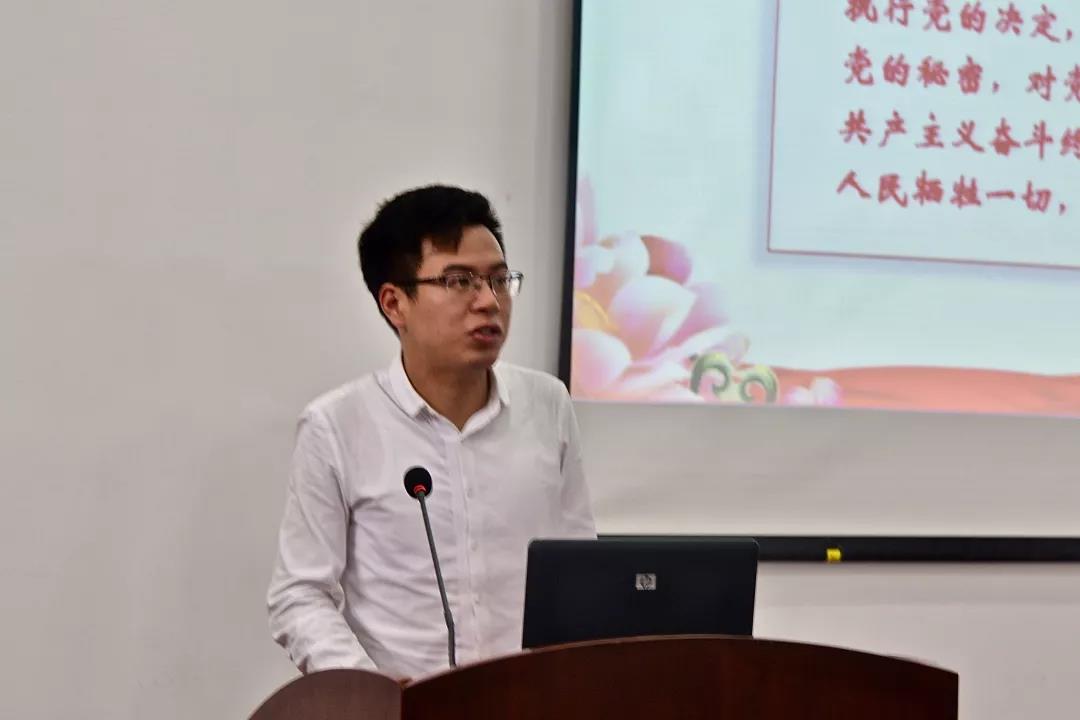 一曲结束,学院党务秘书曾祥轩同志进行发言。他表示进行入党宣誓,对于新党员来说,是最实际、最生动的党的观念的教育,也是进行自我教育的一种很好的形式。