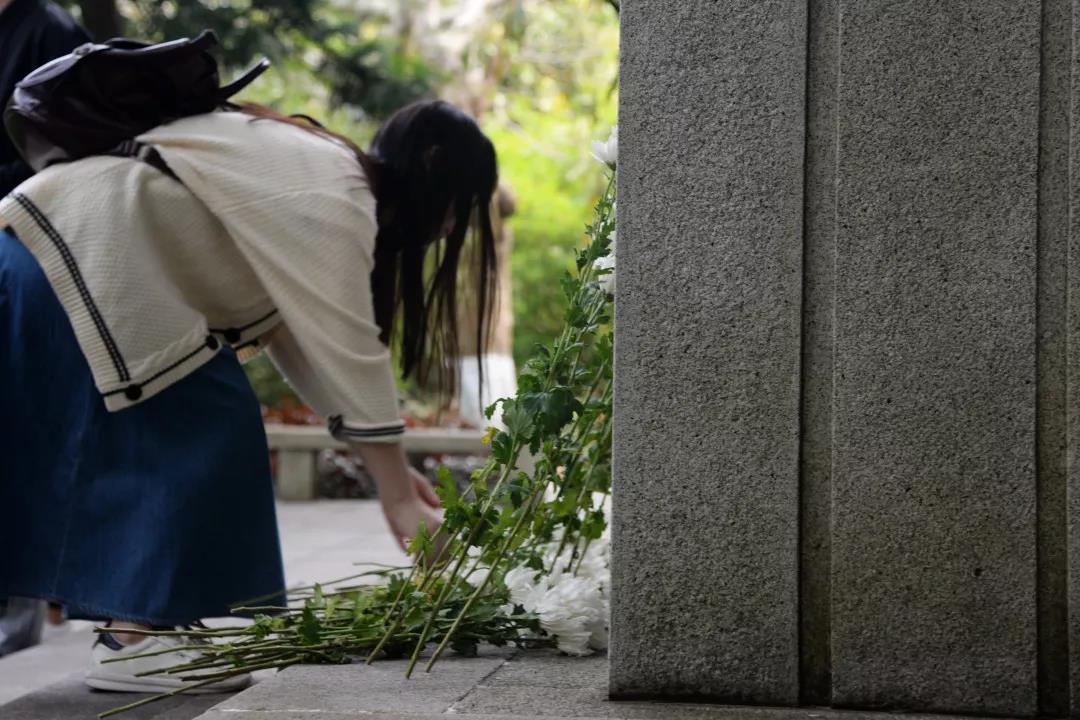 接着,全体成员为萨本栋校长默哀一分钟,在肃穆的默哀中表达我们对萨公的深深敬意。随后大家依次走上前,为萨本栋校长献上一朵朵白色菊花,菊花高洁,一如先生风骨。