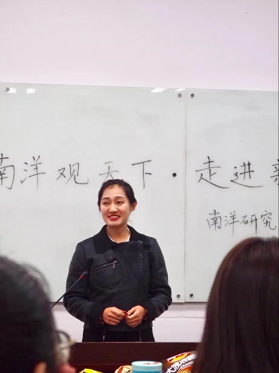 有奖竞答环节到啦,还记得刚刚的小问题吗——新加坡的代表美食有哪些呢?正确答案就是:辣椒螃蟹、海南鸡饭、肉骨茶、叻沙、咖喱鱼头、沙爹!你答对了吗?活动现场来自南洋研究院的胡依林同学准确地回答出了问题并分享了她去往新加坡旅游的感受,获得了本次有奖竞答的精美奖品!
