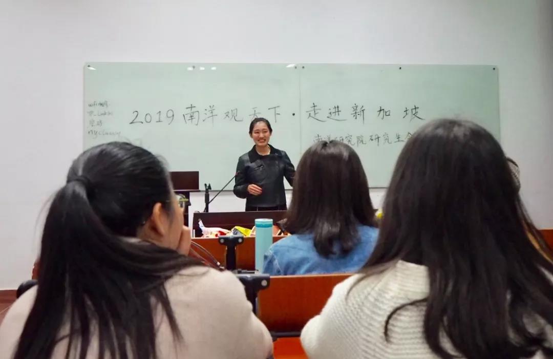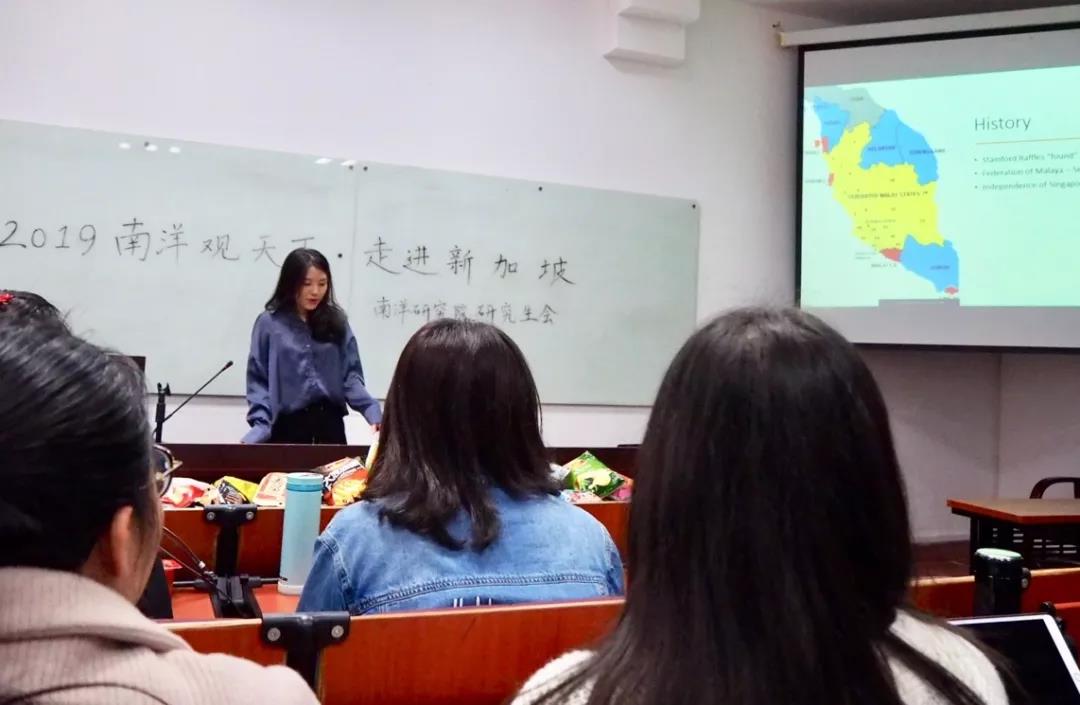 2019年3月8日晚7:30,在厦门大学国际关系学院暨南洋研究院103教室,“南洋观天下·走进新加坡”活动正式开始了。虽然室外下着瓢泼大雨,但活动现场大家热情不减。此次活动的主讲人是来自新加坡的玮娜和17级世界经济专业的硕士研究生陈卉馨,她们分别通过现场演讲和互动交流的方式为我们展示了新加坡等东南亚国家的风采。
