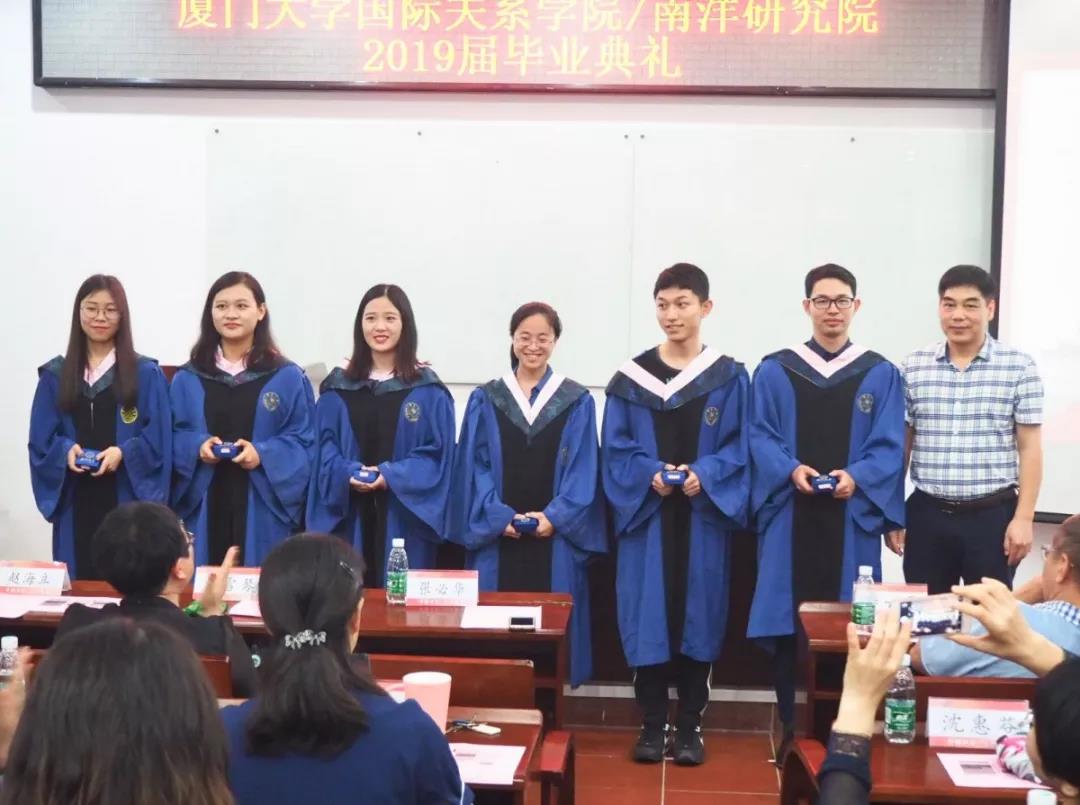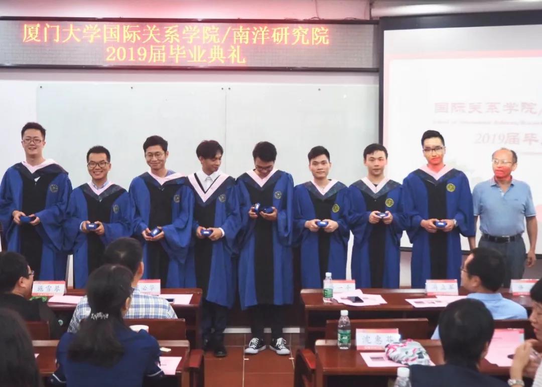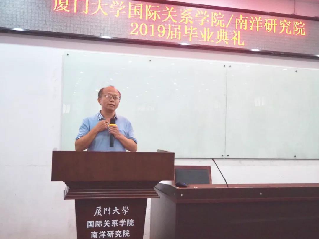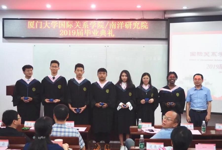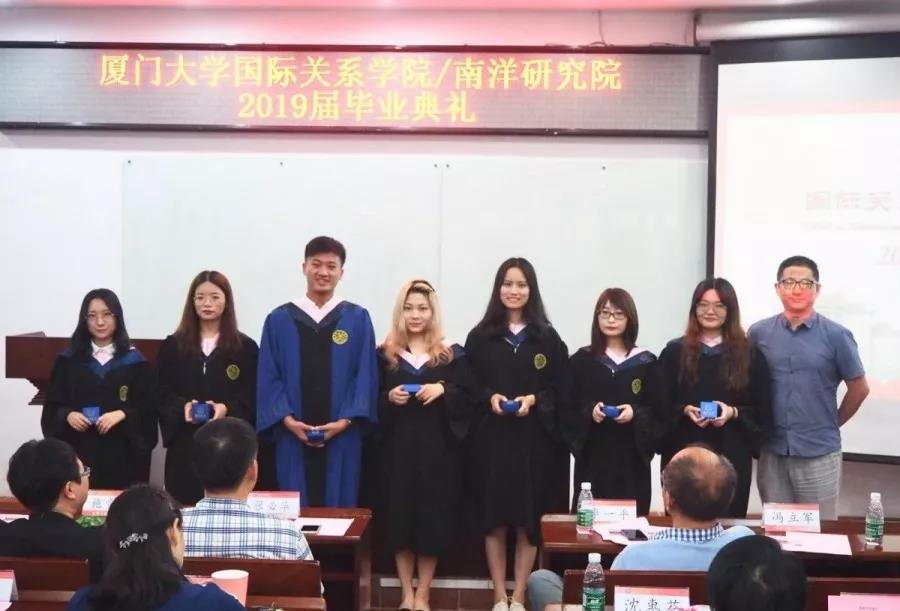 6月13日下午,厦门大学国际关系学院暨南洋研究院2019届学生毕业典礼在南安楼101隆重举行。院党委书记张必华老师、院长李一平老师、副院长施雪琴老师、侨务与外交系主任冯立军老师、国际关系系副主任赵海立老师、东南亚经济研究所所长许可老师,以及沈燕清老师、沈惠芬老师、张淼老师、闫森老师、王昭晖老师、院团委书记曾祥轩老师、辅导员郭晓玲老师出席典礼,典礼由毕业生曹江涵、郑乃齐主持。