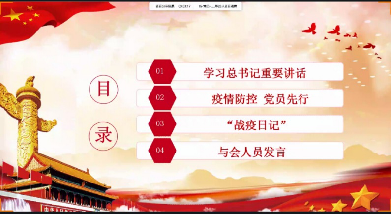 本次会议分为四部分:一是学习习近平总书记重要讲话,二是疫情防控,党员先行,三是战役日记,四是与会人员发言。