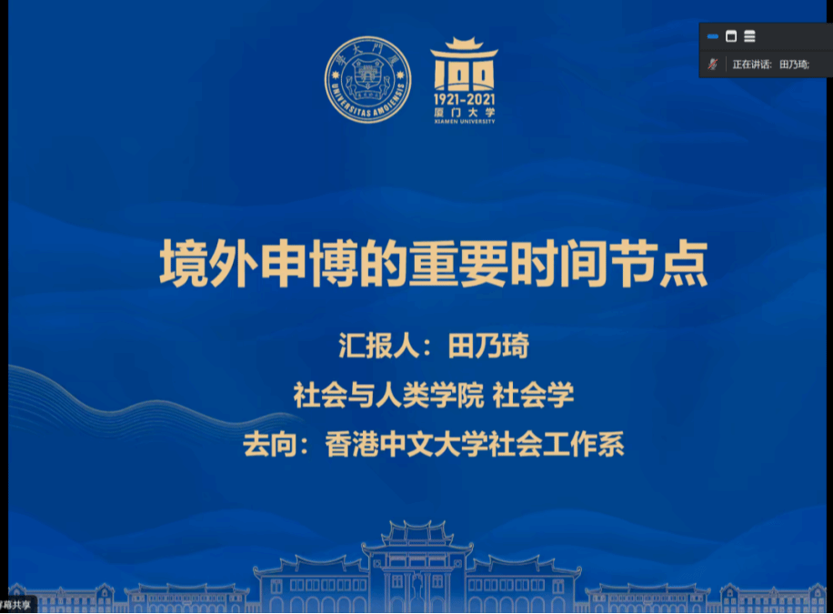 为促进研究生更高质量升学,帮助同学们更好地了解博士研究生的申请流程,由校研究生会、学生会主办,我院研究生会与公共事务学院/公共政策研究院研究生会、社会与人类学院研究生会联合承办的2023-2024学年厦门大学“朋辈引航”第七期活动暨充电赋能站第四期活动于6月21日晚顺利举办。本期活动的主题为“朋辈引领,‘博’采众长”申博经验分享,分享会采取线上会议的形式进行,邀请了五位不同专业方向的嘉宾,围绕境内外申博攻略、学术简历撰写技巧、论文准备、导师联系与复试经验分享等与同学们分享申博经验。