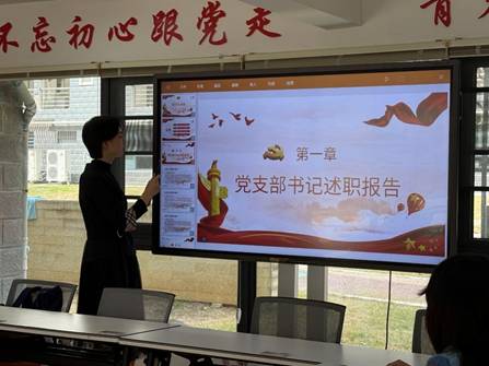 会议伊始,党支部书记刘佳宜代表支部委员会进行年度述职。报告围绕党建工作履职情况、存在问题以及下一步改进措施三个方面进行了系统总结。