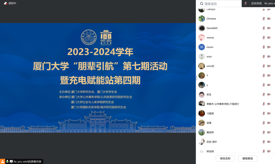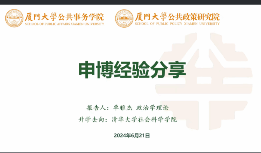 为促进研究生更高质量升学,帮助同学们更好地了解博士研究生的申请流程,由校研究生会、学生会主办,我院研究生会与公共事务学院/公共政策研究院研究生会、社会与人类学院研究生会联合承办的2023-2024学年厦门大学“朋辈引航”第七期活动暨充电赋能站第四期活动于6月21日晚顺利举办。本期活动的主题为“朋辈引领,‘博’采众长”申博经验分享,分享会采取线上会议的形式进行,邀请了五位不同专业方向的嘉宾,围绕境内外申博攻略、学术简历撰写技巧、论文准备、导师联系与复试经验分享等与同学们分享申博经验。