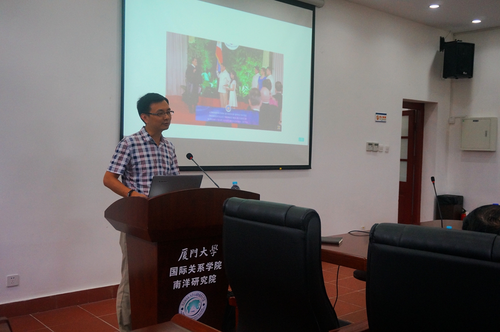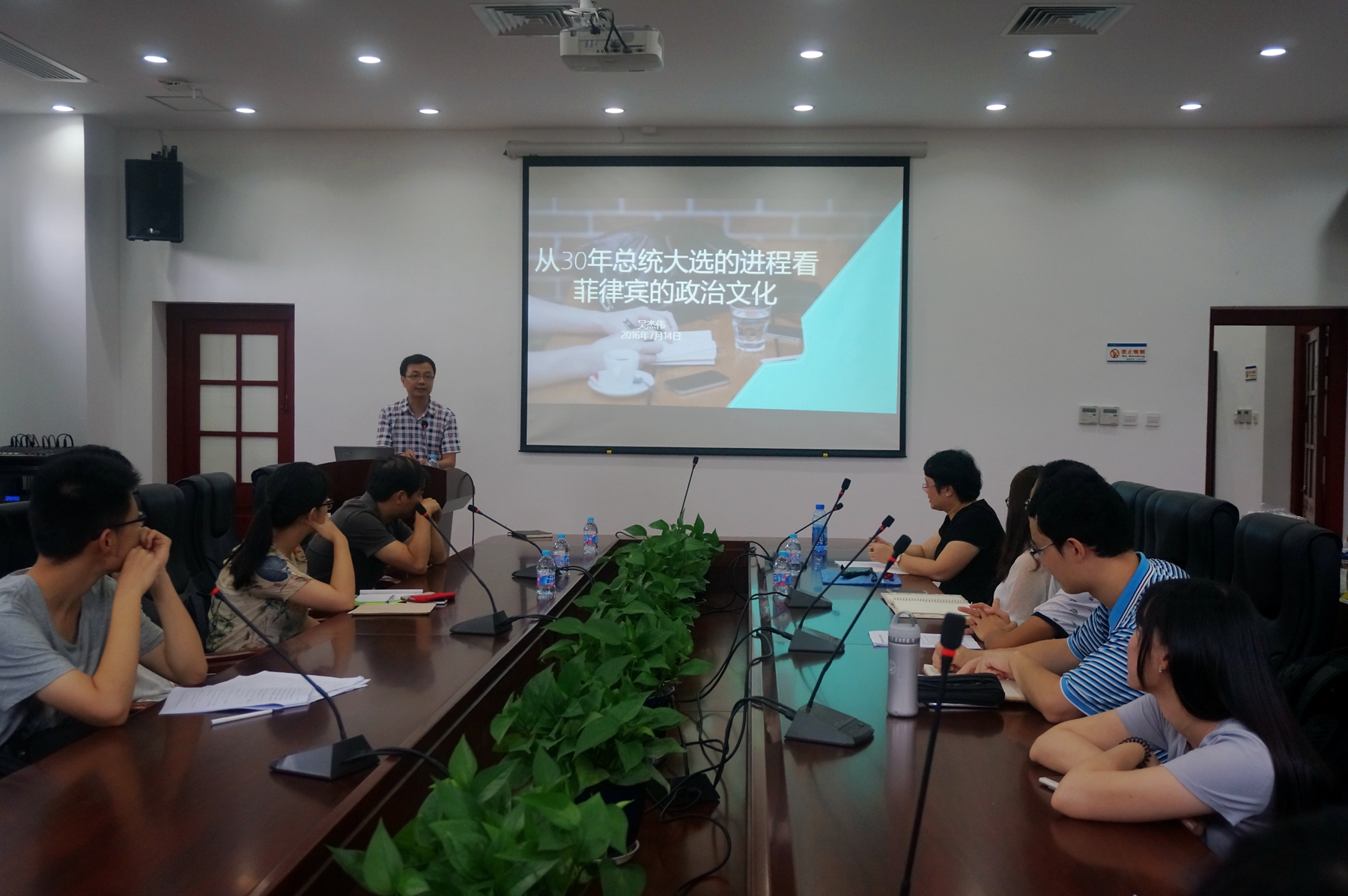 2016年7月14日15时,北京大学外国语学院副院长吴杰伟教授在南安楼301(3)室,为厦大师生作题为“从30年总统大选看菲律宾的政治文化”的讲座,本次讲座由国际关系学院副院长范宏伟教授主持,施雪琴教授、赵海立副教授、张旭东副教授、王虎副教授等出席。