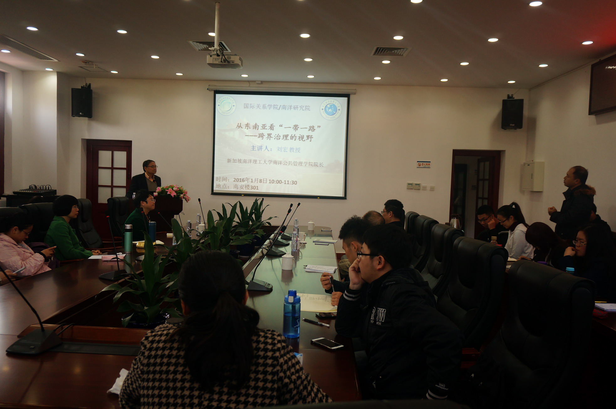 2016年1月8日上午,在南安楼301(3)会议室,新加坡南洋理工大学刘宏教授应邀为我院师生作题为“从东南亚看‘一带一路’——跨界治理的视野”的学术报告,厦门大学南洋研究院副院长施雪琴教授主持报告。刘宏教授是南洋理工大学公共管理学院和人文与社会科学院院长,陈嘉庚讲座教授,他长期从事侨务政策研究,是国家侨务办的咨询顾问,在学术领域与政治领域都具有重大影响力。此次报告刘宏教授从东南亚诸国的角度和与会者探讨了“一带一路”这个目前堪称世界热点的中国话题。