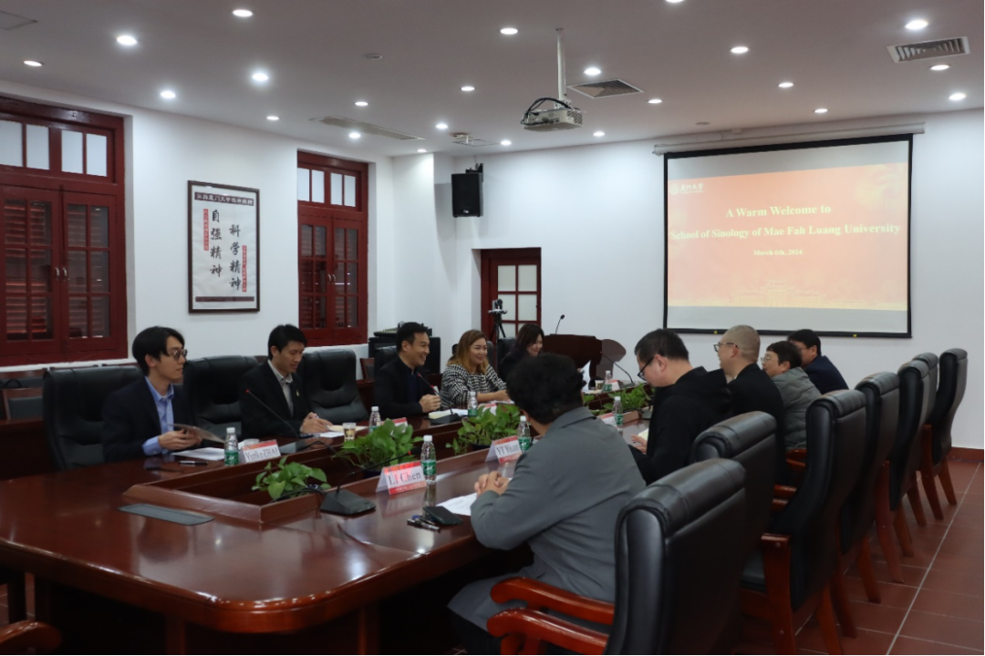 2024年3月6日,泰国皇太后大学汉学院院长Teeraparp Predeepoch陈昌旭、汉学院中国研究专业主任Ekachai Taweepworachai盘富进、商务汉语专业主任Maneeporn Saksoong莎妙慧、教师翟云柯和Nang Ying Htaung谢淑玲一行5人来访我院。