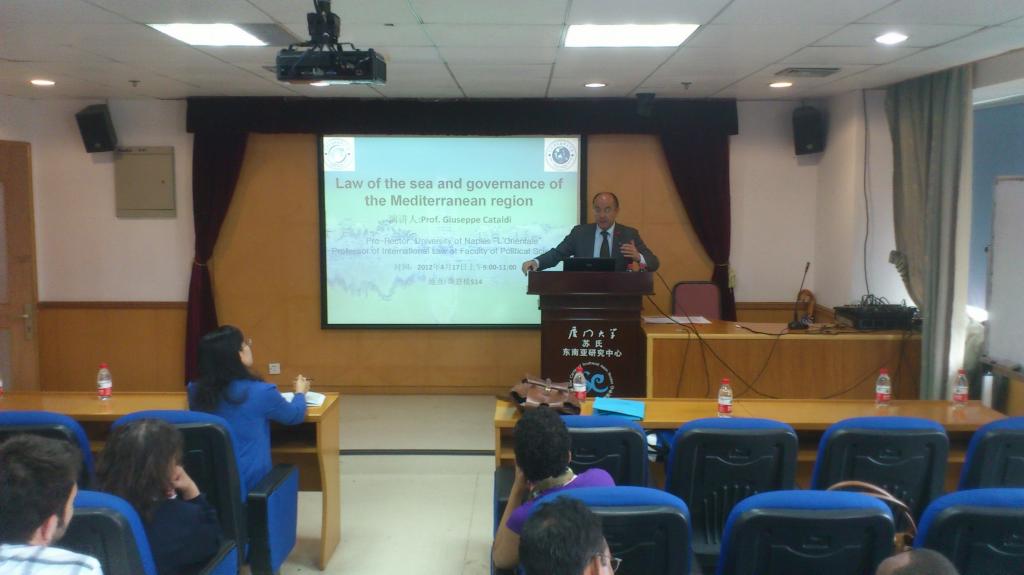 2012年4月17日上午9:00,那不勒斯东方研究大学副校长.Giuseppe Cataldi教授在厦大颂恩楼514会议室举办名为 《海洋法与地中海海域的海洋管辖》(Law of the sea and governance of the Mediterranean region)的学术讲座,本院师生聆听了讲座。