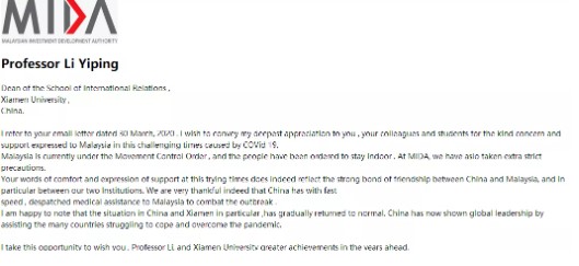 “谨此诚挚地感谢贵院的关心,希望我院在日后可以和贵院有更多合作和交流的机会,谨此祝您和院上老师们身体健康,生活愉快,更祝中马两国国泰民安,和平进步。”