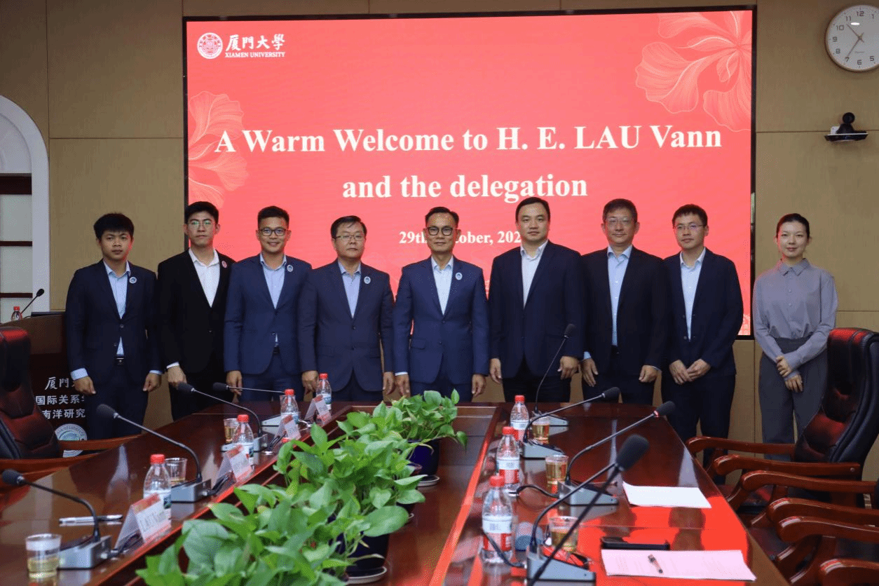 2025年10月29日,柬埔寨公共事务和运输部国务秘书、洪森亲王及夫人奖学金协会(A.M.T)代表团教育机构事务和国际学生事务主任Lau Vann一行六人与我院开展座谈会。厦门大学国际关系学院/南洋研究院院长高艳杰教授、许可副教授、隋雪濛助理教授和厦门大学招生办胡雪磊老师参加本次座谈,座谈会由厦门大学国际关系学院/南洋研究院国际关系系副主任王昭晖副教授主持。