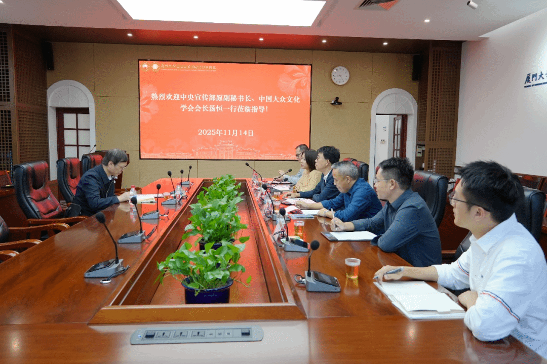 2025年11月14日,中央宣传部原副秘书长、中国大众文化学会会长汤恒来访厦门大学国际关系学院/南洋研究院并在南安楼301-3会议室开展调研座谈会。座谈会由我院党委书记邱旺土主持,学校宣传部副部长杨机像,我院副院长张淼副教授等出席本次座谈。