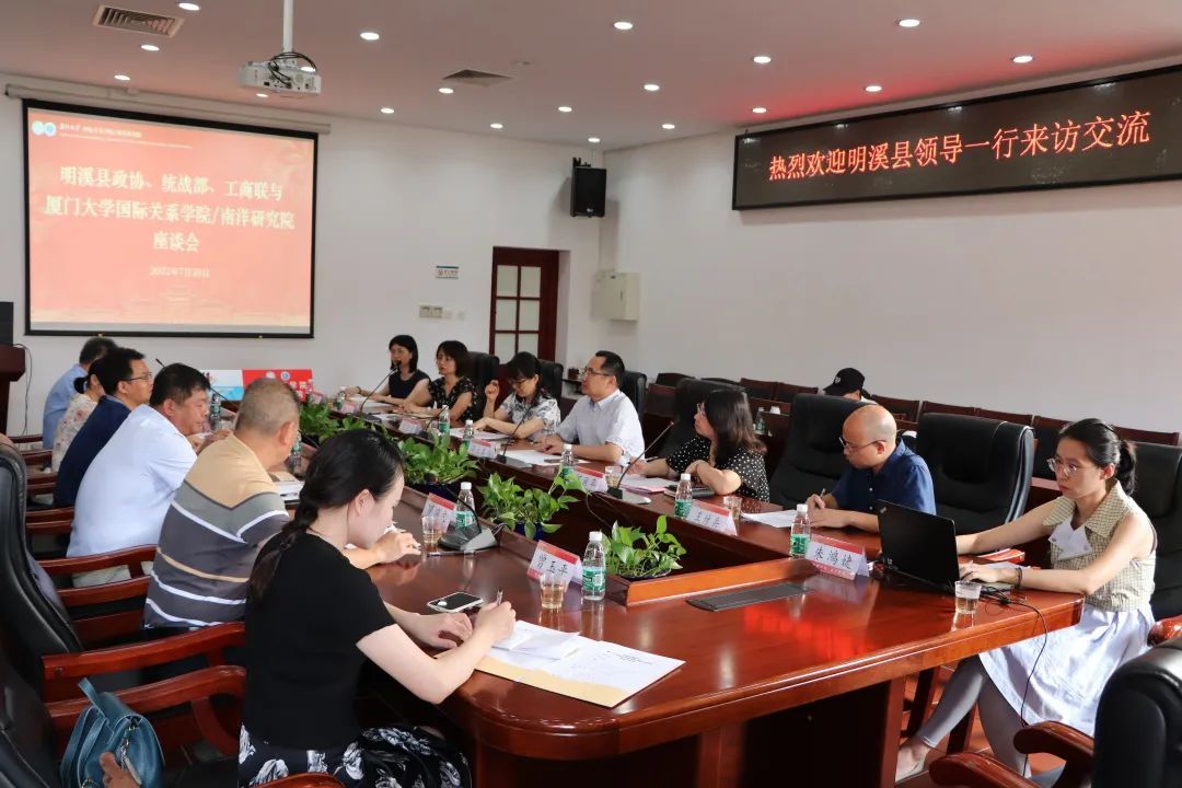 副院长冯立军教授首先对明溪县领导和乡贤的到访表示欢迎,随后介绍学院的历史沿革。他强调华侨华人研究从建院初期至今一直是学院研究重点和特色。老一辈南洋人“归侨”身份为华侨华人研究带回珍贵的资料同时也打下扎实的研究基础。学院经过近70年的发展,研究领域不断扩大,形成扎根南洋,关注周边,放眼世界的新格局,科学研究方面也培育了高校智库建言献策的新增长点。同时,人才培养,学科建设也有一定建树。本科两个专业分别获得国家级、省级一流专业建设点立项。他表示学院同明溪县的共建合作为师生开展侨乡调研提供良好平台,为侨情研究提供宝贵的机会。