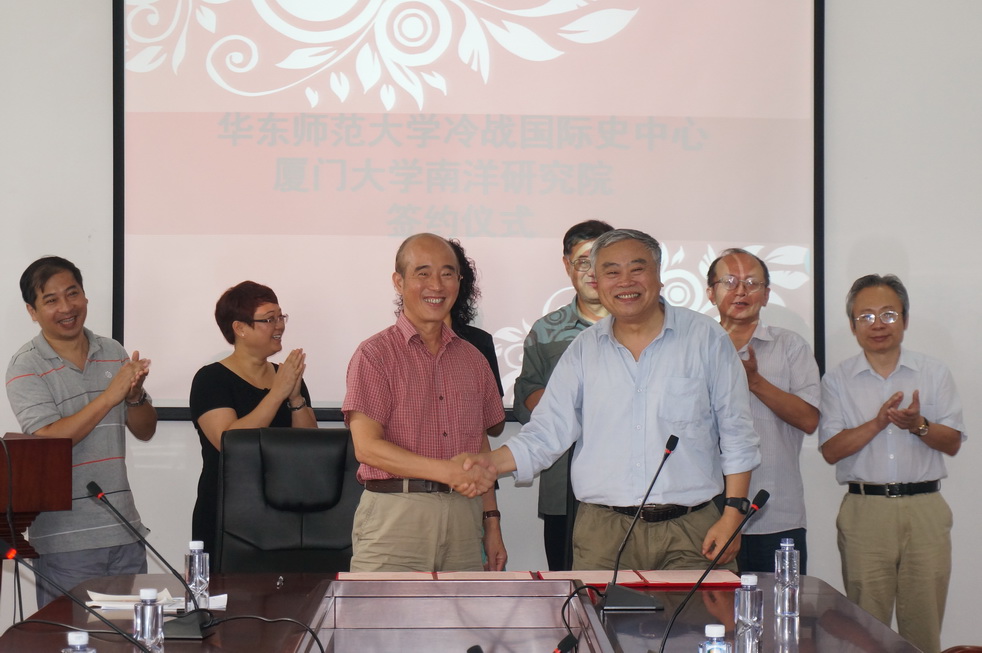 2014年9月29日,厦门大学南洋研究院和华东师范大学冷战国际史研究中心联合成立了“华东师范大学—厦门大学东南亚研究工作室”。首先,厦门大学南洋研究院院长庄国土教授和华东师范大学冷战国际史研究中心主任沈志华教授,代表双方在南安楼3楼会议室签署了合作研究的协议。根据协议,双方将在下列领域展开合作:互设东南亚研究工作室,加强双方的研究生与青年学者的交流和培养,共享文献资料,共同主办学术会议,特别是对冷战时期中国与东南亚关系的档案文献搜集、整理、研究进行合作,出版大型的系列档案汇编和研究丛书。签字仪式结束后,庄国土教授和沈志华教授为工作室进行了揭牌。出席此次合作协议签字仪式、工作室揭牌仪式的还有华东师范大学历史系韩钢教授、中央党校王海光教授、南洋研究院党委书记范丽、副院长李一平教授、副院长施雪琴教授和范宏伟教授等。