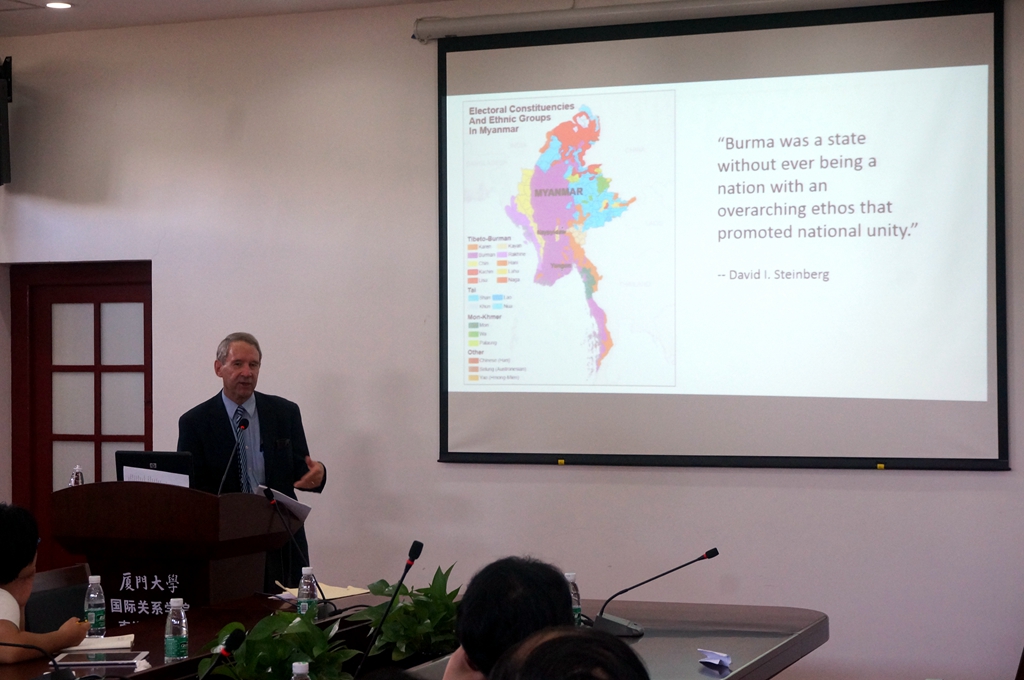 2016年7月1日上午,著名东南亚研究专家Kenton J.Clymer代表美国北伊利诺伊大学与厦门大学国际关系学院/南洋研究院签署了合作协议,并应邀进行题为A Forgotten Cold War Story: The United States and Burma during the Cold War的讲座。本次活动由厦门大学国际关系学院/南洋研究院副院长施雪琴主持。