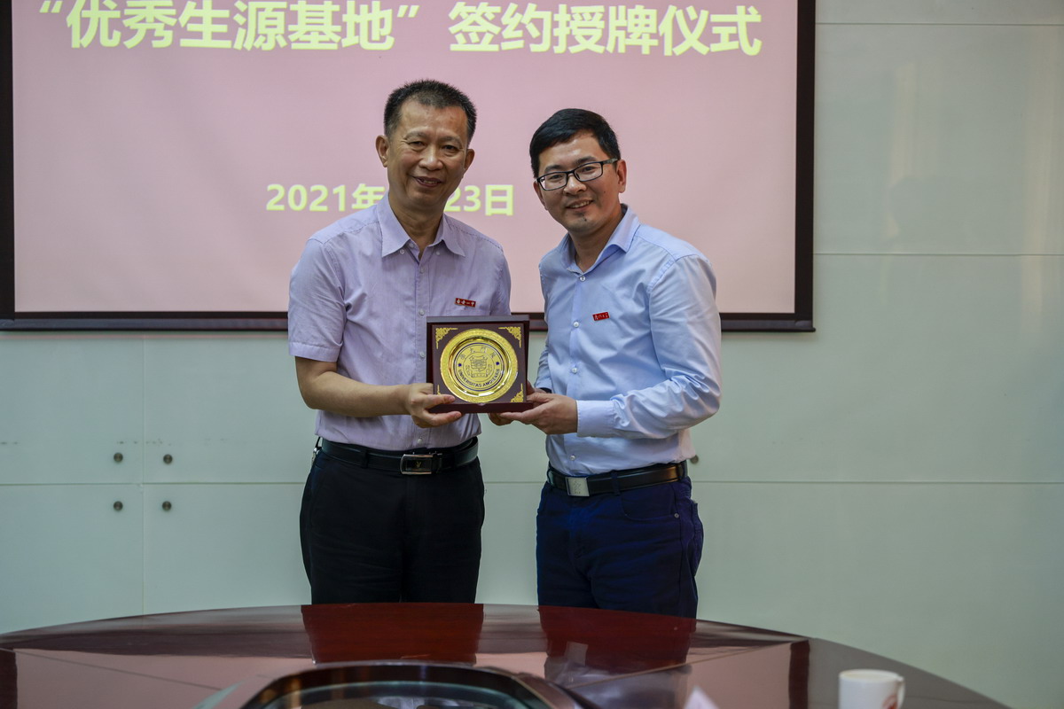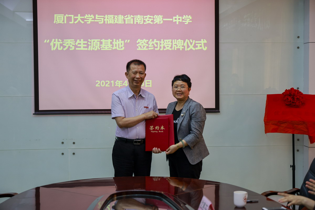 在师生共同的见证下,施雪琴副院长向陈国璋校长授予“厦门大学优质生源基地”牌匾,陈泗林老师向陈国璋校长赠送了厦门大学纪念牌。