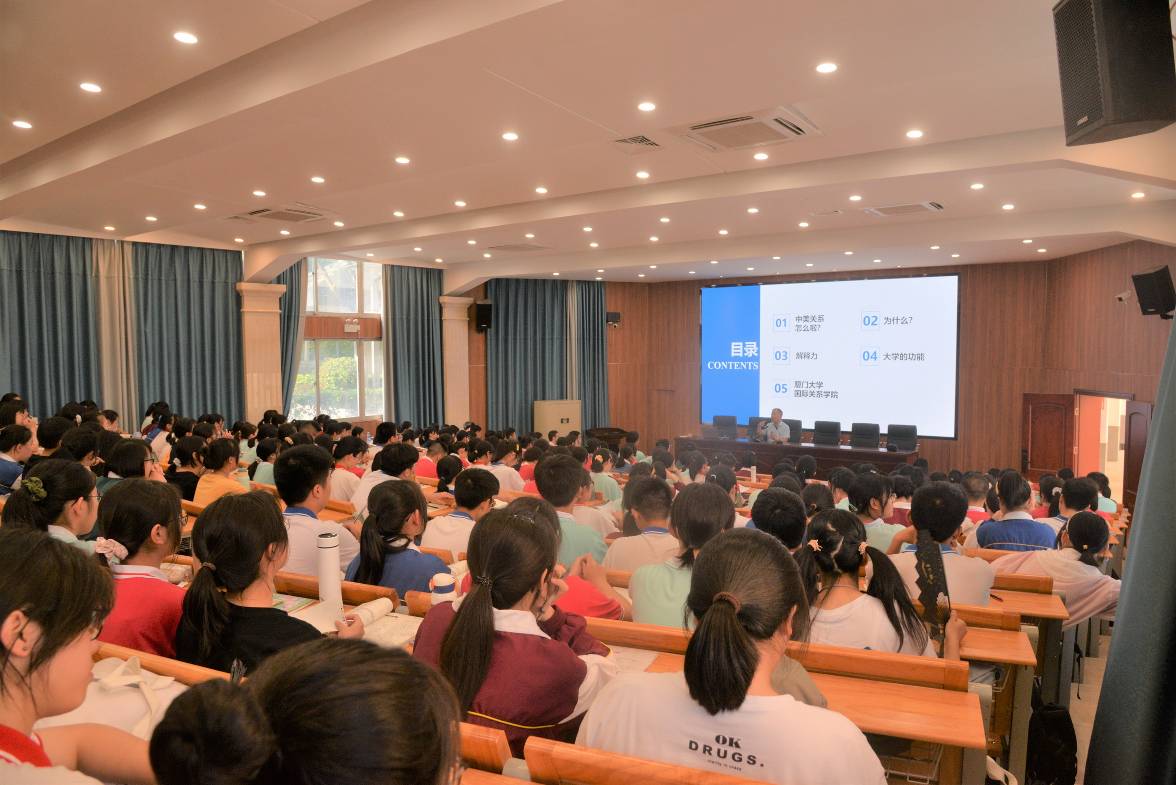 仪式结束后,赵海立副教授为南安一中的同学们作了“中美关系怎么了?”的国际关系科普讲座,该讲座是“相约百年厦大,百名教授走进重点高中系列讲座”之一。赵海立老师用幽默风趣的语言为同学们引入了国际关系这一概念,并以三个具体的案例为同学们介绍了国际关系这一门学科的意义价值以及怎样运用国际关系理论来分析国际时事。首先赵老师以近年的热点事件中美贸易战作为开端,讲解了美国的关税制裁对中国的影响和中国的反应;其次以干涉为主线,依次介绍了美国对中国不同地域——台湾、香港、新疆以及南海地区的干涉。在讲座中,赵海立副教授还深处浅出的讲解了国际关系理论,如用新干涉主义、权力转移理论等理论方法或视角看待国际政治问题;最后赵老师介绍了印太战略,认为这一战略是亚洲版的北约,引起了在座学生的共鸣。最后,赵海立老师总结了大众眼中的国际关系和作为学科存在的国际关系之间的区别,使得国际关系这一学科的必要性和价值以及其本身作为报考专业的选项进入了同学们的视野。