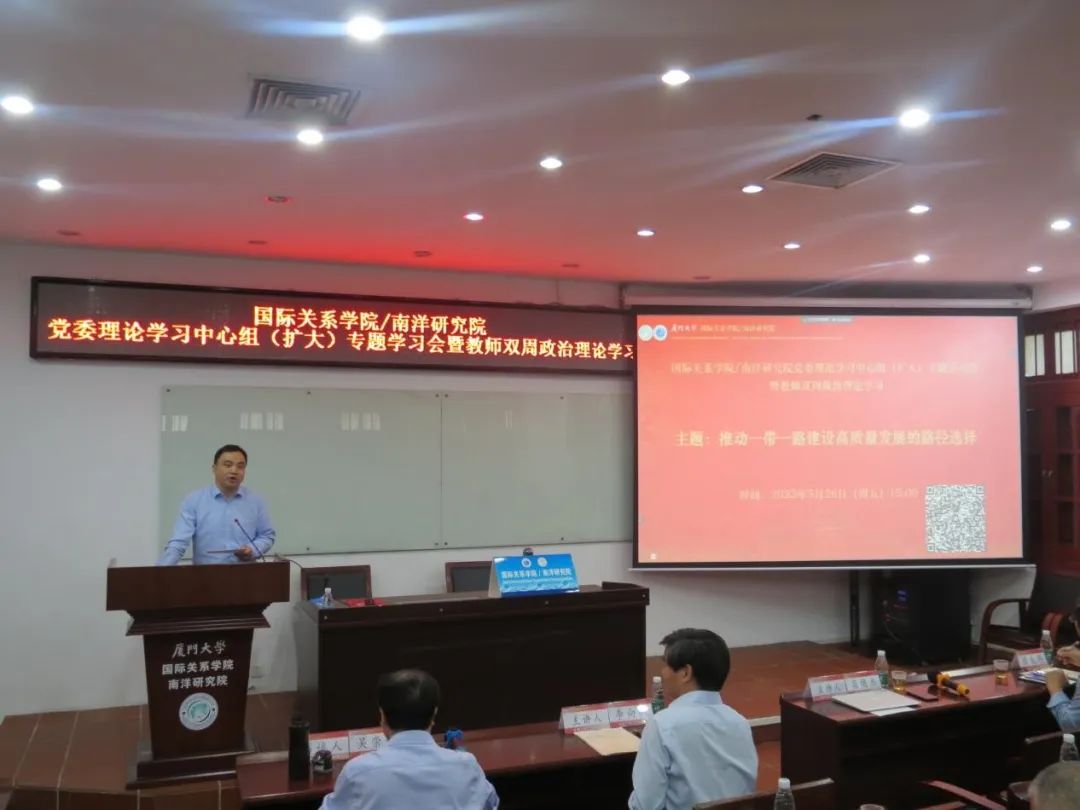 2023年5月26日下午,南强学术讲座第1160讲暨国际关系学院/南洋研究院党委理论学习中心组(扩大)专题学习会在厦门大学南安楼101会议室举行。本次讲座特邀李向阳研究员为主讲人,主题为“推动‘一带一路’建设高质量发展的路径选择”。李向阳研究员现任中国社会科学院亚太与全球战略研究院院长,《当代亚太》与《南亚研究》主编,同时担任中国亚太学会会长、中国美国经济学会副会长。厦门大学国际关系学院/南洋研究院高艳杰副院长担任主持人,吴崇伯教授担任与谈人。