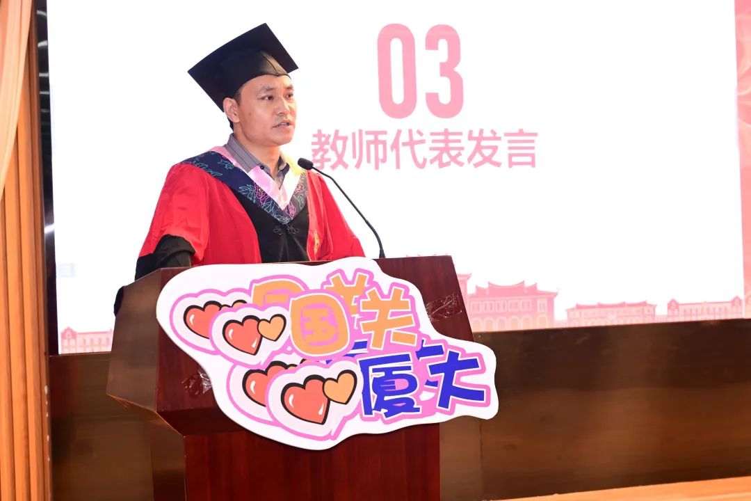教师代表包广将副教授以“保持爱与被爱的能力”为主题进行发言。他认为目前我们爱与被爱的能力正面临诸多方面的冲击:一是理性的冲击,二是竞争的冲击,三是技术的冲击。他表示当我们越来越依赖规则,越来越依赖技术的时候,我们只会与物化的规则、物化的机器打交道,我们不喜欢、不愿意,也将没有能力与他人沟通和交往。“我们越来越进入到一个物化的技术世界,这个被人工智能迅速物化的技术世界不断挤压着我们的情感世界……”他号召在理性泛滥、竞争加剧、技术进步的同时,不要弱化了我们爱与被爱的能力。最后他希望所有的毕业生在今后的岁月中,都能生活在爱与被爱的世界里。