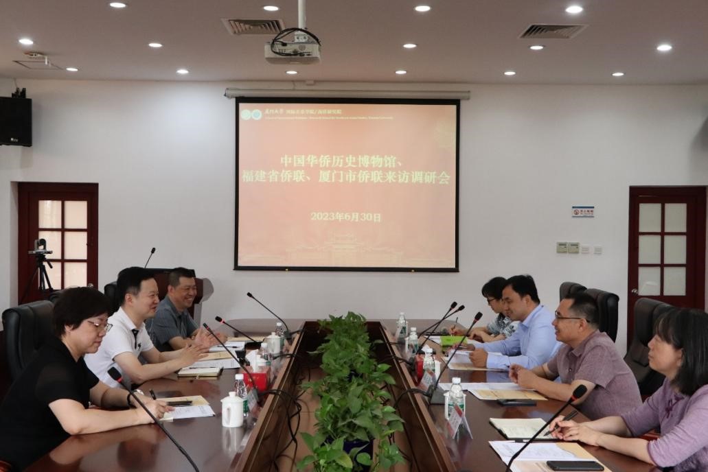 2023年6月30日上午,中国华侨历史博物馆副馆长(主持工作)宁一、福建省华侨历史文化研究中心主任郑建新、厦门市侨联党组成员林中英等一行来我院调研。学院高艳杰副院长(主持工作)、冯立军副院长、沈燕清副院长以及副研究馆员张长虹参加调研会,多方就未来的合作进行了友好交流。