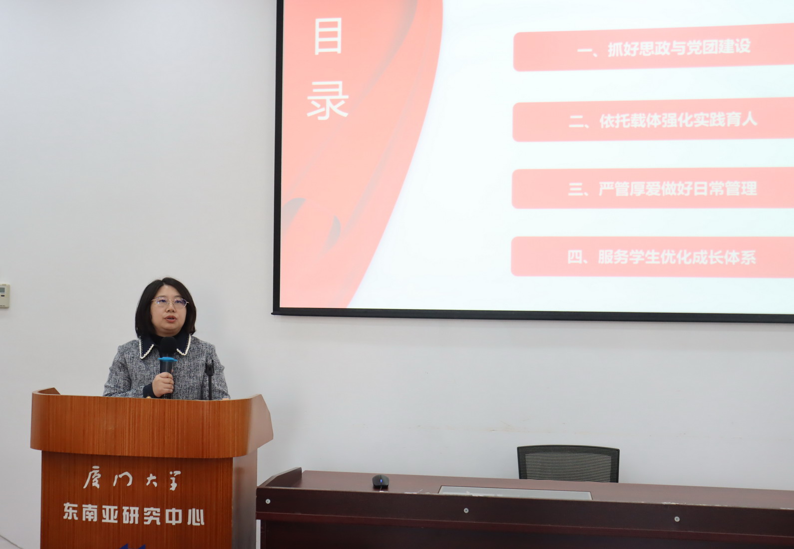 冯立军副院长、沈燕清副院长、张淼副院长和何丽苹副书记分别就分管工作进行总结。冯立军副院长总结本科教学评估、本科招生宣传、创新人才培养体系、教学立项与获奖、本科教学同行交流研讨等工作;沈燕清副院长总结举办学术会议和学术讲座、申报科研项目和奖项、智库平台搭建、科研平台实体化建设、基础研究、非学历教育、图书馆、校友等工作;张淼副院长总结提高研究生培养质量、修订研究生培养方案、建设国际研究生专班、深化对外交流和合作、建立马来西亚海外工作站、开设“鹭岛南望”专栏等工作;何丽苹副书记总结学生思想政治教育、党团建设、实践育人、严管厚爱日常管理、服务学生优化成长体系等工作。
