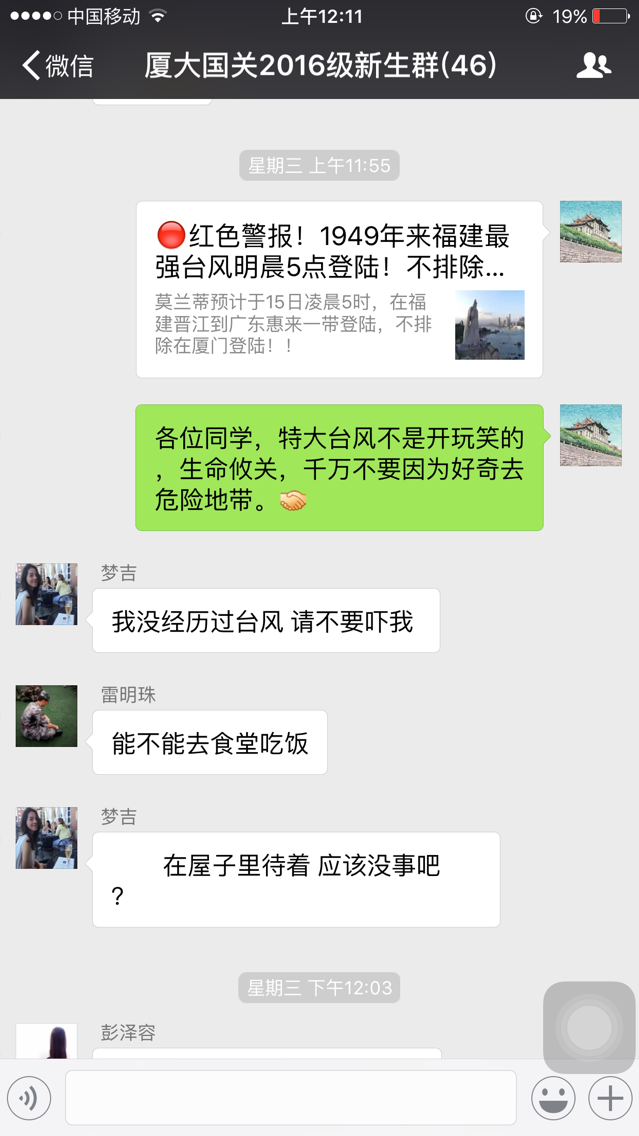 从9月11日台风生成之初开始,我院辅导员便通过QQ、微信、邮件等方式,不断向学生传递台风的最新动向,并细致地叮嘱注意事项。盈盈数行字,尽力安抚着学生躁动不安的情绪。