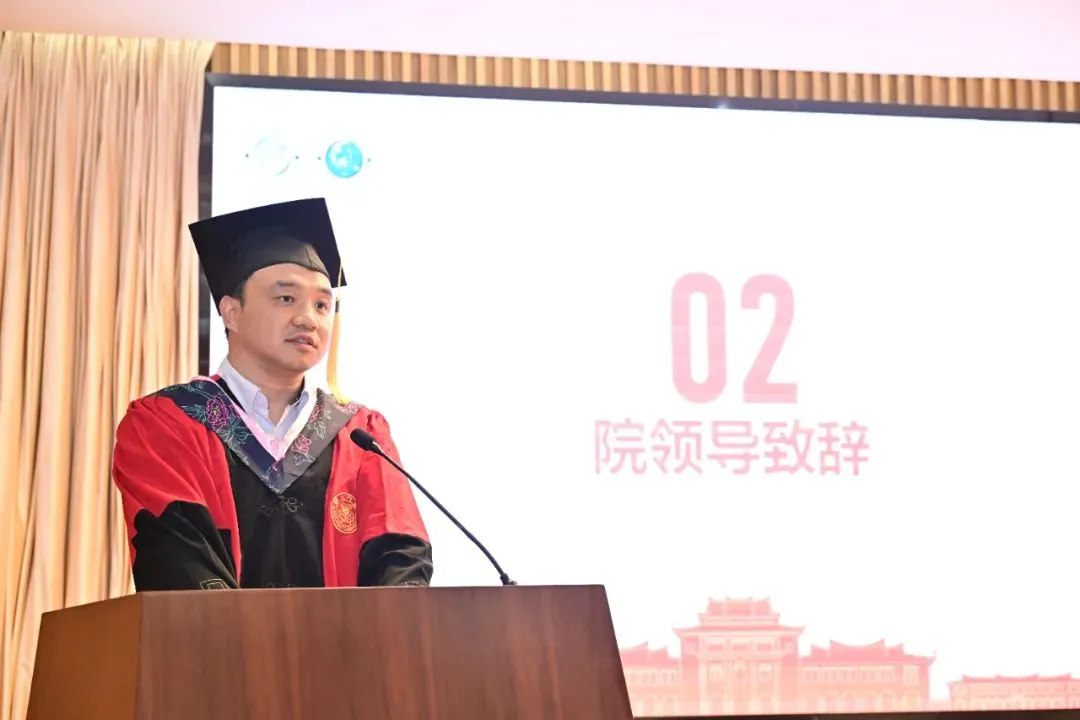 院长高艳杰教授代表学院致辞。他首先对顺利完成学业、开启全新的人生旅程的2024届全体毕业生致以最热烈的祝贺。随后他向毕业生们分享了几点人生建议:一是要心存感恩;二是要学会坚持;三是享受过程。他最后寄语毕业生:“学院永远是你们温暖的家园和坚强的后盾,我们乐于分享你的成功,也会在你失意时助你一臂之力。希望大家常回来看看!”