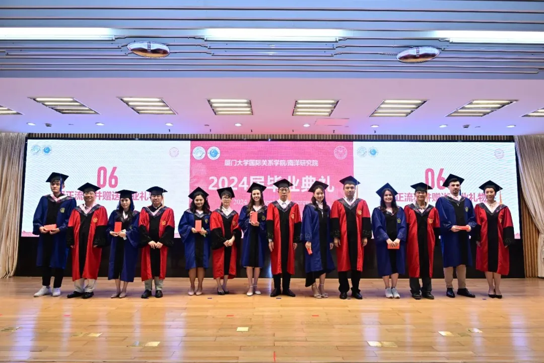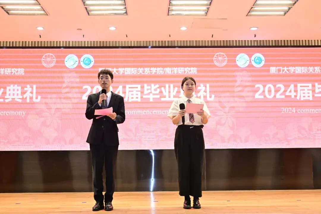 2024年6月18日下午,厦门大学国际关系学院/南洋研究院2024届毕业典礼在科艺中心一楼多功能厅举行。学院党政领导、全体教职员工、2024届毕业生和家长代表齐聚一堂,共同见证这一美好时刻。毕业典礼由2024届毕业生万偲蕾和周洋主持。