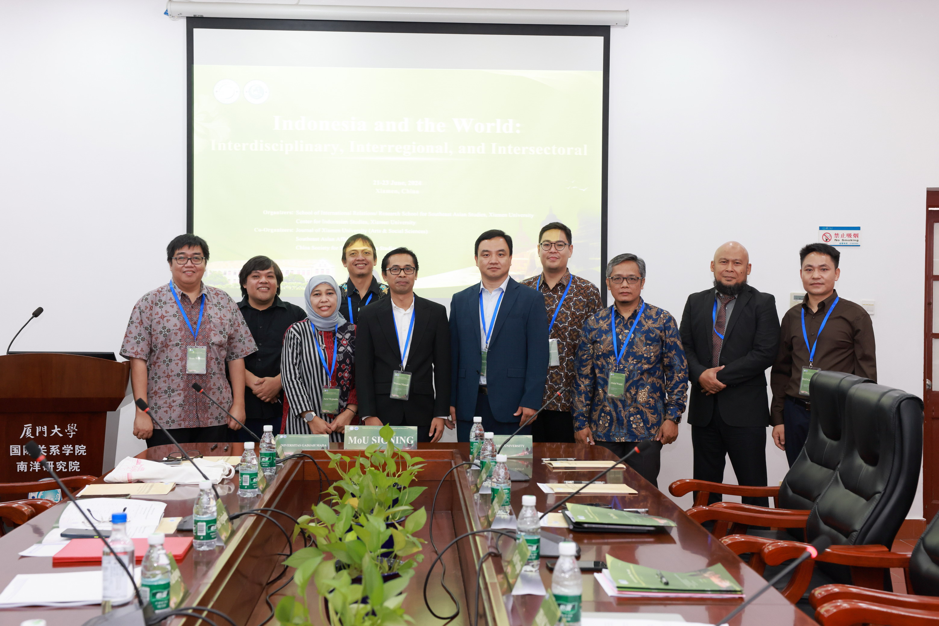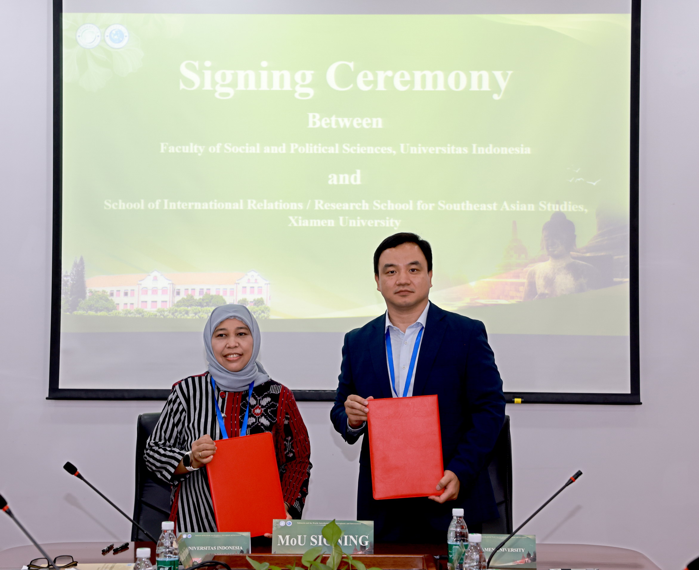 2024年6月22日,厦门大学国际关系学院/南洋研究院分别与印度尼西亚大学社会与政治科学学院和加查马达大学社会与政治科学学院签署合作协议,签约仪式在厦门大学南安楼隆重举行。厦门大学国际关系学院/南洋研究院院长高艳杰教授、印度尼西亚加查马达大学社会与政治学院院长瓦万·马苏迪教授(Wawan Masudi)、印度尼西亚大学社会与政治学院国际关系系主任阿雅·维尔贾尼(Asra Virgianita)分别作为三方代表签署协议。厦门大学国际关系学院/南洋研究院副院长张淼副教授、印尼研究中心主任包广将副教授及印尼方访问代表出席签约仪式。