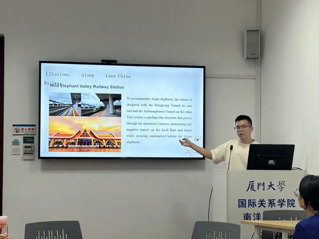 7月8日晚,“中老铁路行,感知中国情”活动指南暨“中老铁路”介绍分享会在厦门大学南安楼105举行。国际关系学院/南洋研究院助理教授苏世天从在老挝的田野经历及数年来对“一带一路”基础设施研究的专业角度出发,结合自身乘坐中老铁路的体验,向在场的师生详细介绍了中老铁路与沿线车站的概况、中老铁路建设的难度、铁路建设前后给沿途带来的巨大变化等方面内容。通过分享会,国际学生们初步认识到中老铁路在推动跨国绿色产业链建设、深化区域合作与人文交流等方面的重要纽带作用。