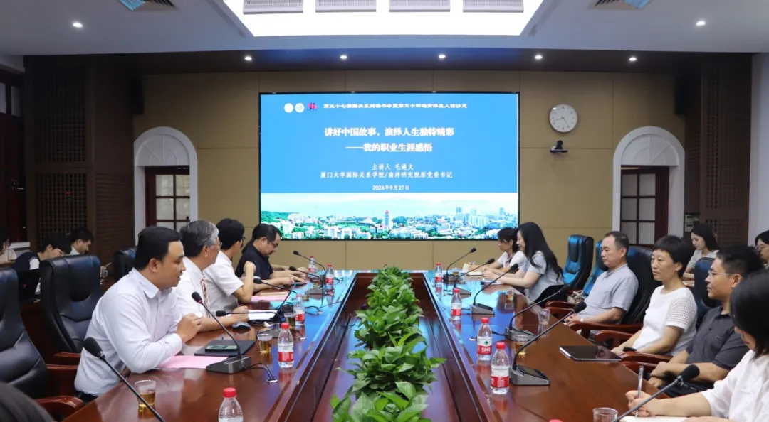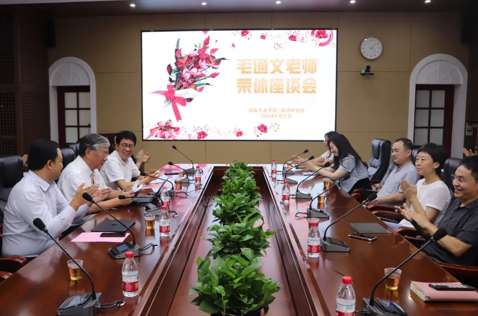 2024年9月27日下午,国际关系学院/南洋研究院学院领导和师生代表在南安楼301-3会议室齐聚一堂,为学院原党委书记毛通文老师举办了温馨而隆重的荣休仪式,共同祝贺毛通文老师光荣退休。荣休仪式后,毛老师为师生作题为“讲好中国故事,演绎人生独特精彩——我的职业生涯感悟”讲座。荣休仪式和讲座分别由院党委书记邱旺土和院长高艳杰主持。
