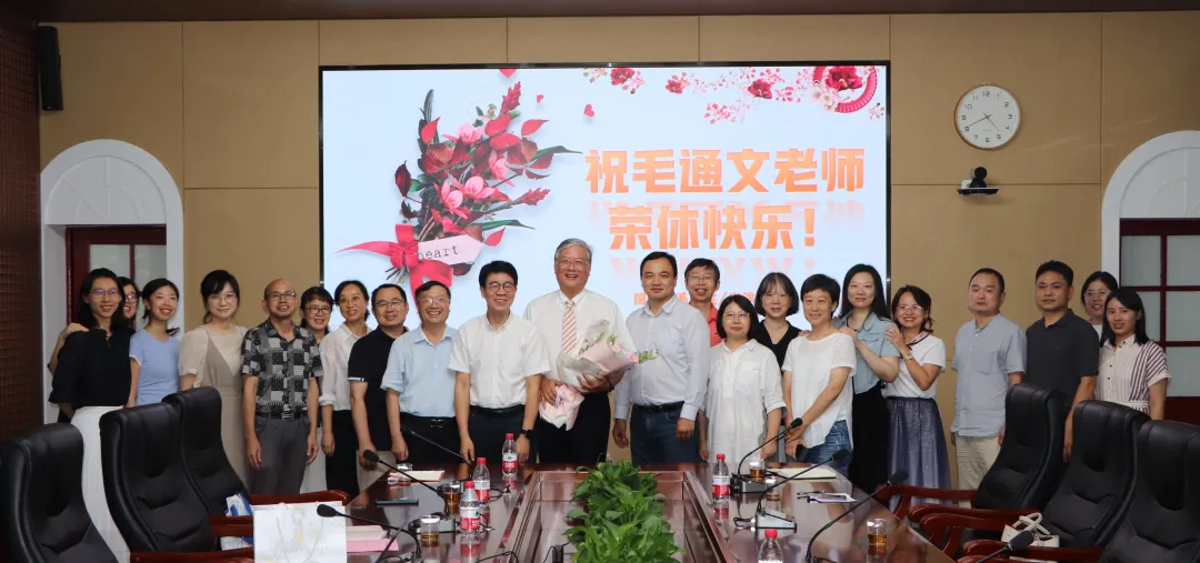 邱旺土书记和高艳杰院长代表学院向毛通文老师赠送纪念品和鲜花,全体教师与毛老师合影留念,共同记录这一难忘时刻。