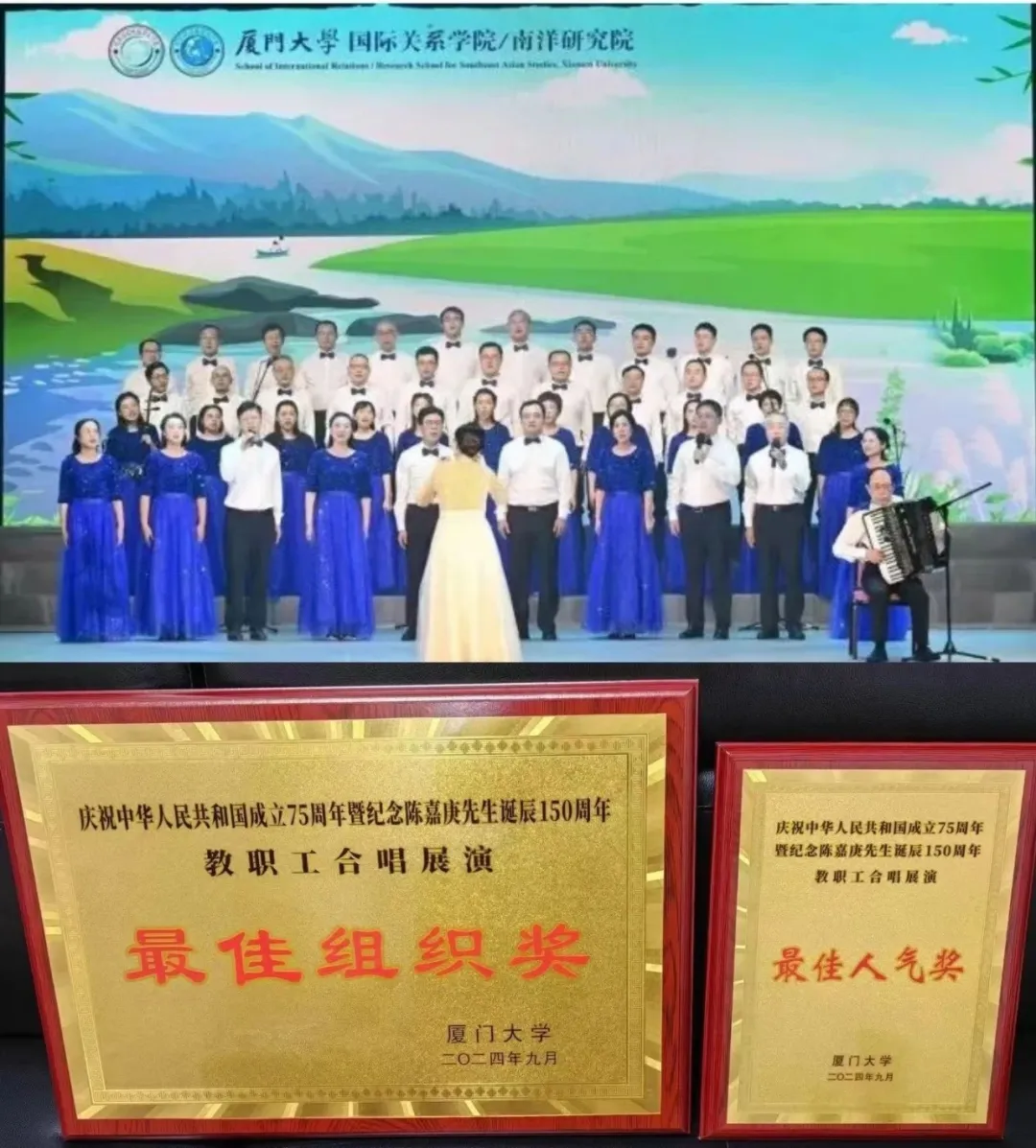 群团工作活力满满。2024年9月,厦门大学国际关系学院/南洋研究院教职工参加厦门大学庆祝中华人民共和国成立75周年暨纪念陈嘉庚先生诞辰150周年教职工合唱展演,荣获“最佳组织奖”和“最佳人气奖”。